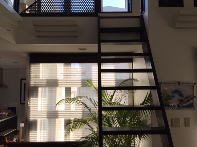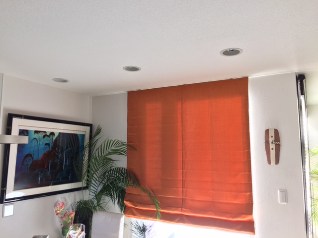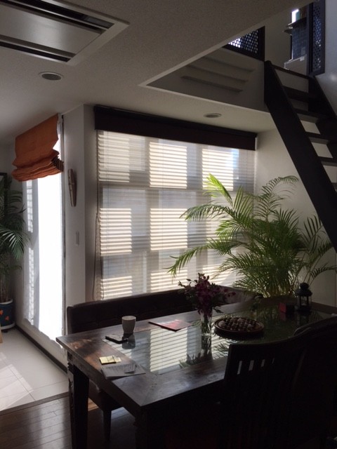 今回新しく設置したカーテンは生地がじゃばらになっているプリーツスクリーンというシンプルなブラインドにし色も家具や建具に合わせて濃いブラウンで統一。キッチンの前にアクセントでオレジをもってきました。この生地はスイスの会社フィスバの生地です。とても発色のいいオレンジで写真ではわかりにくいですが光沢のあるしなやかなファブリックです。ブラウンの中のオレンジが引き立っててとっても素敵でした♪