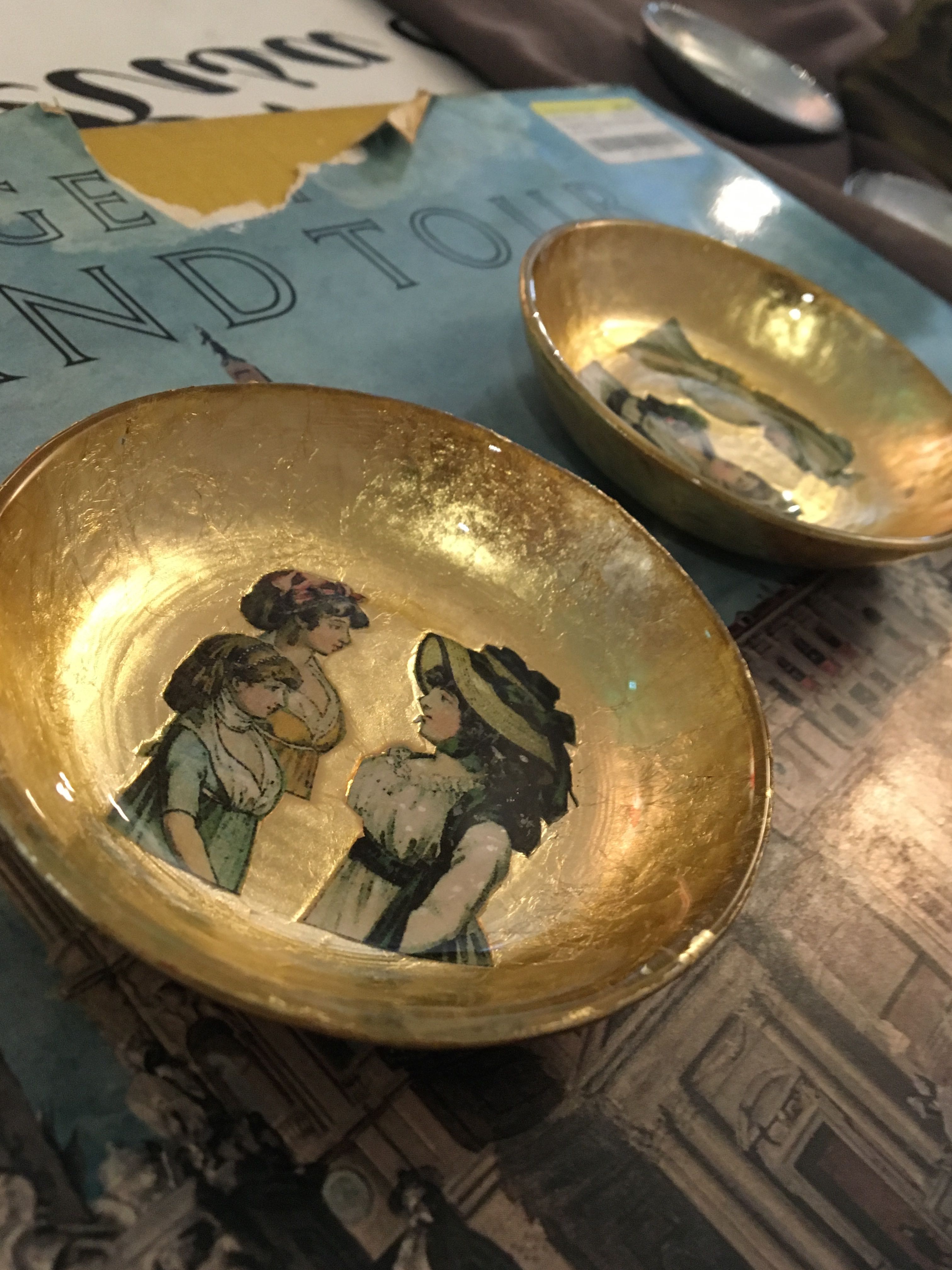 こちらは、私がつくった豆皿です。フランスの蚤の市でゲットしたポストカードを封じ込めてみました。これは1Fのショップで使います!背景に使った生地はカーテン生地としても大人気PASAYAのレース。