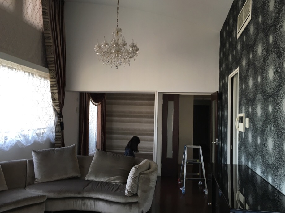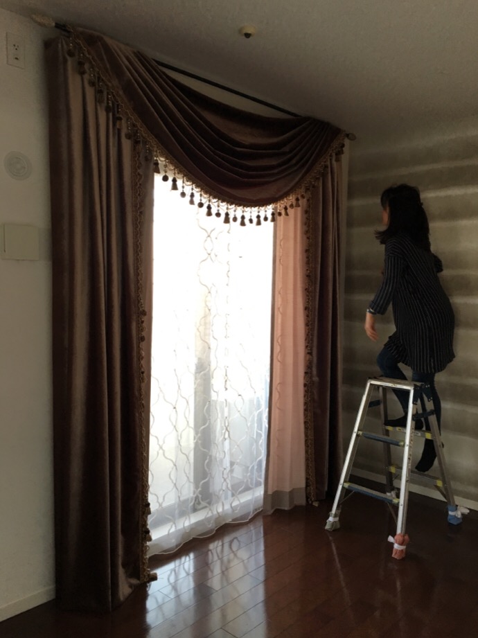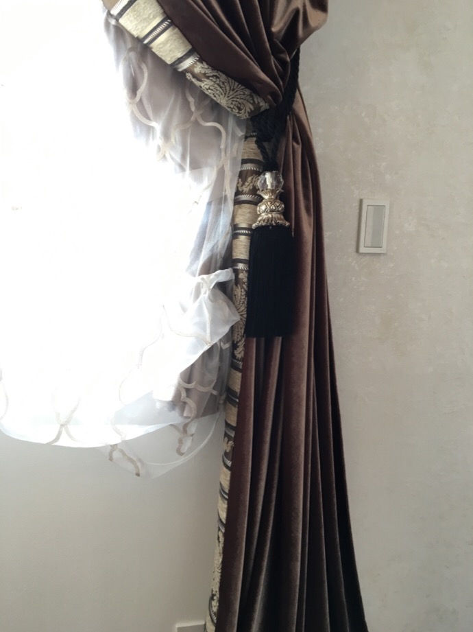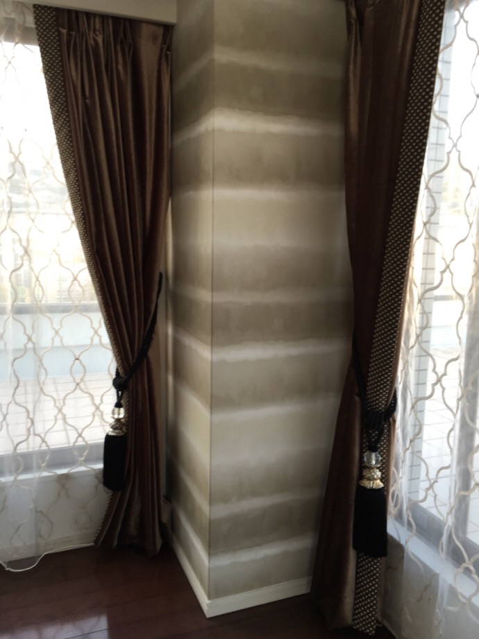 マンションの最上階4.5もの天高のお部屋の壁紙とウインドウトリートメントをさせていただきました。まずは壁紙気に入っていただいたのがAnthologyの壁紙です。この壁紙を採用される方はかなりのインテリアマニアでないと考えられません。とてもセンスのあるご自分のテイストがはっきりされた方なので迷いはありません。かなり日差しが強いということで窓上部は固定のカーテン。間に壁がありので一体感を出すために、カーテンは窓の部分だけではなく、壁まで隠しました。4.5mところからおちるカーテンはダイナミック、今旬なベロアベルベット。なんかさみしいということでバンディングを考えましたが、ピッタリの生地を見つけるまで絶対に妥協はしません。お客様も根気強く待っていただけました。バンディング生地も別の窓は変えて、そしていつも感じるのですが、お客様からのヒントやアイデアがなければ、こんな素敵なカーテンはできません。隣の窓はスワッグでというごきぼうだったので、ダイナミックなワンスワッグ。もしお客様からのご希望が強くなかったら2スワッグにしていたかもしれまでん。逆光でしかも広角でないので写真がうまくとれなかったのですが、近いうちに一眼レフで素敵な写真を撮ってあっぷいたします。