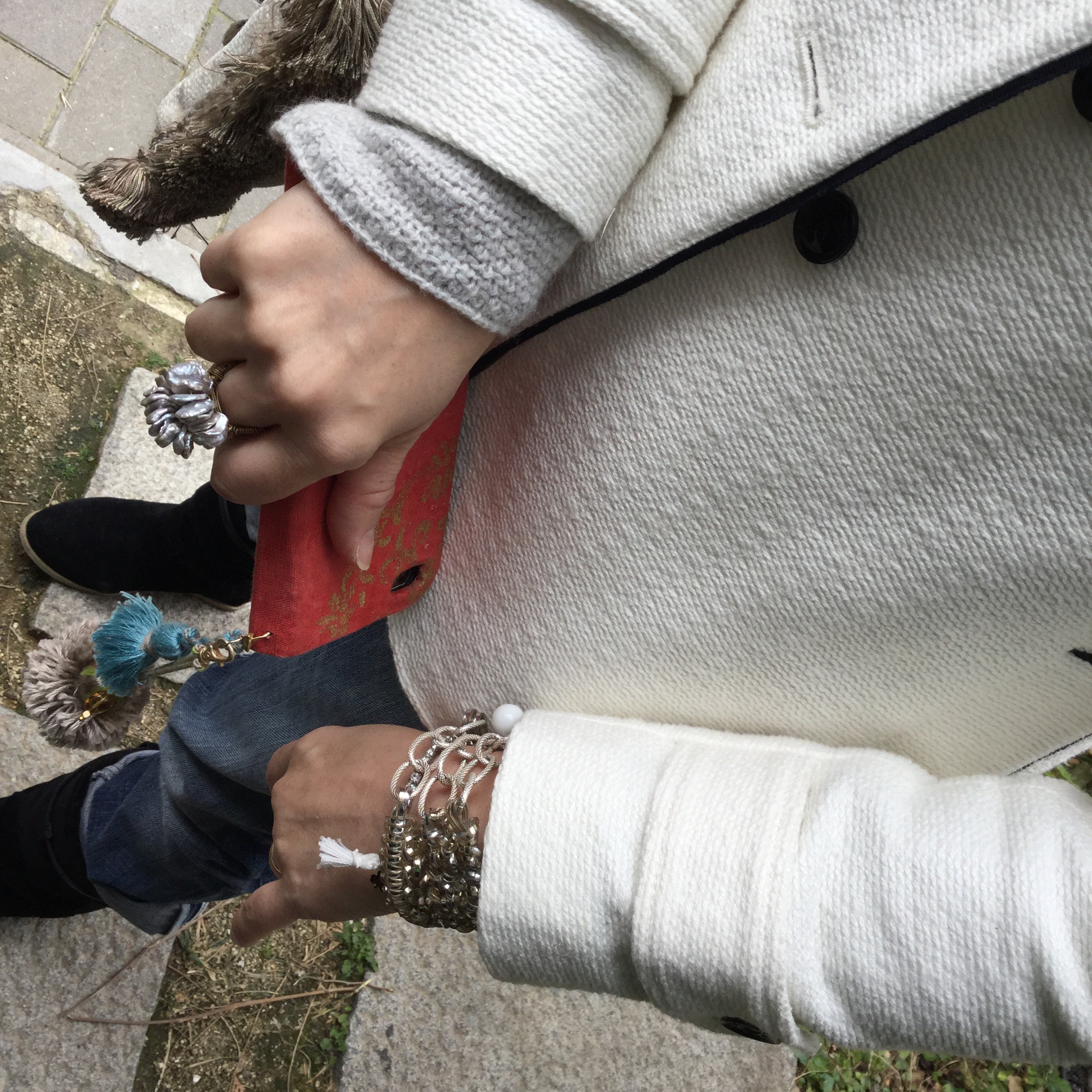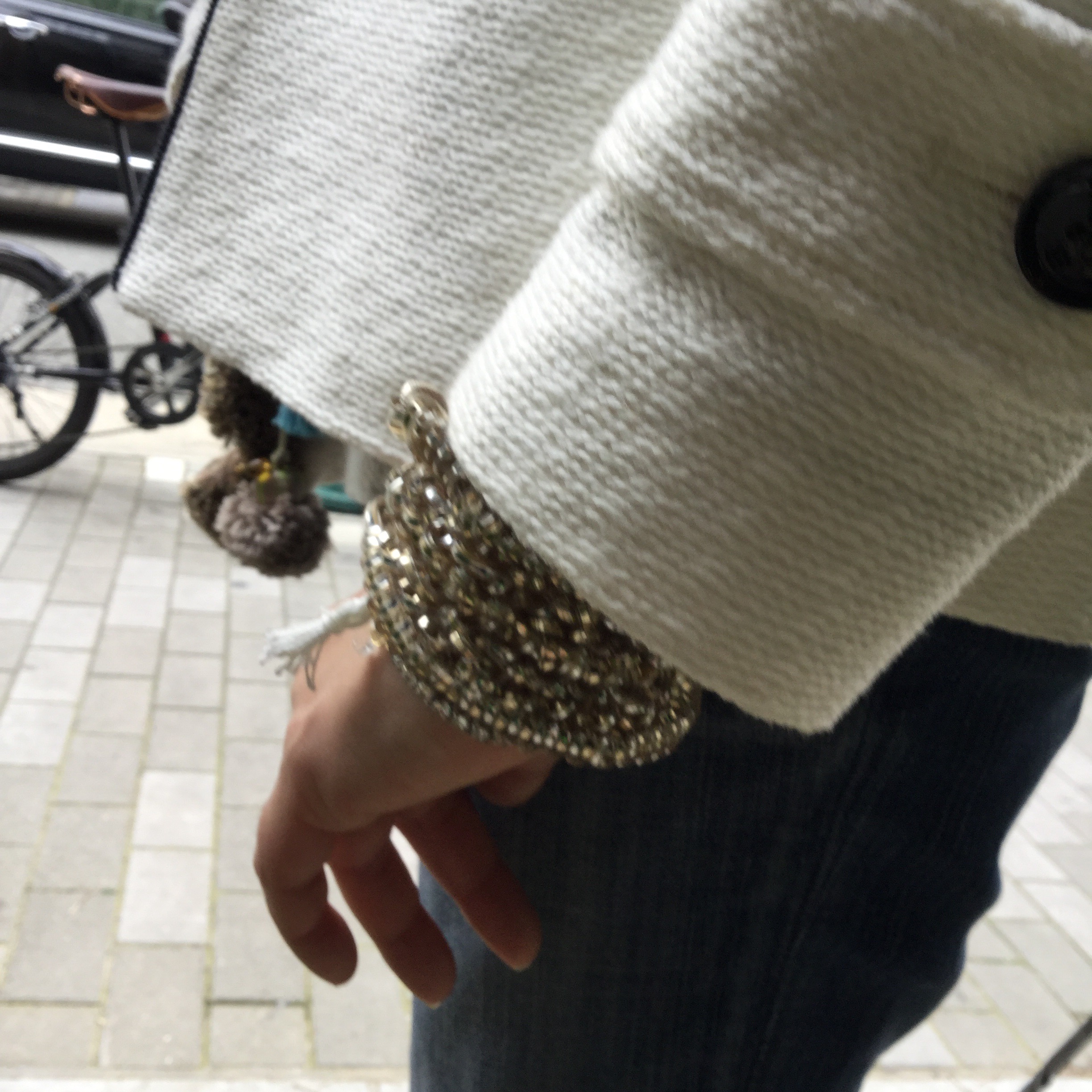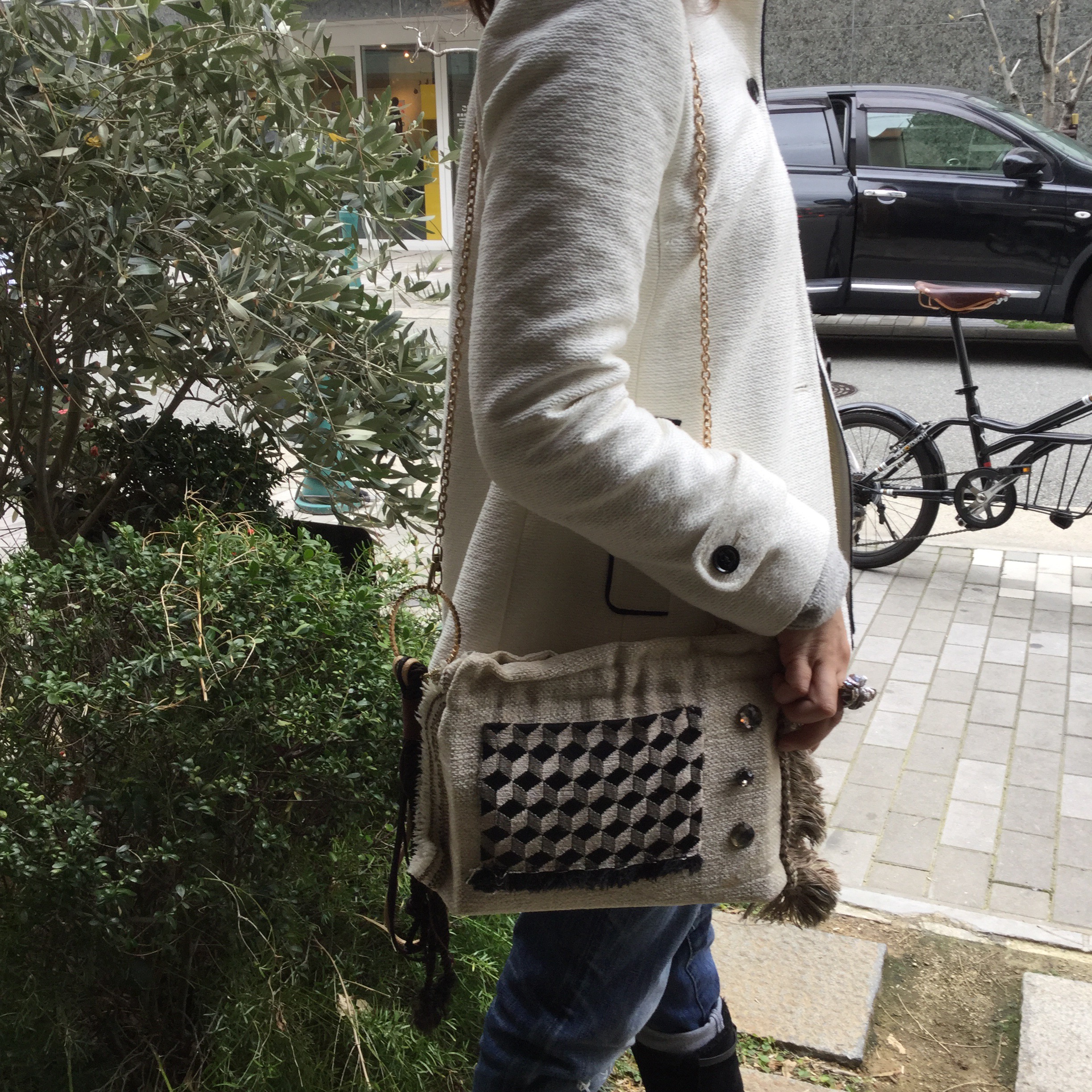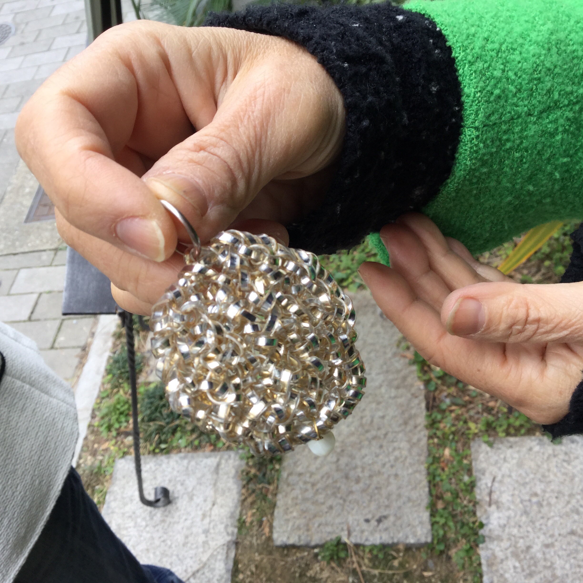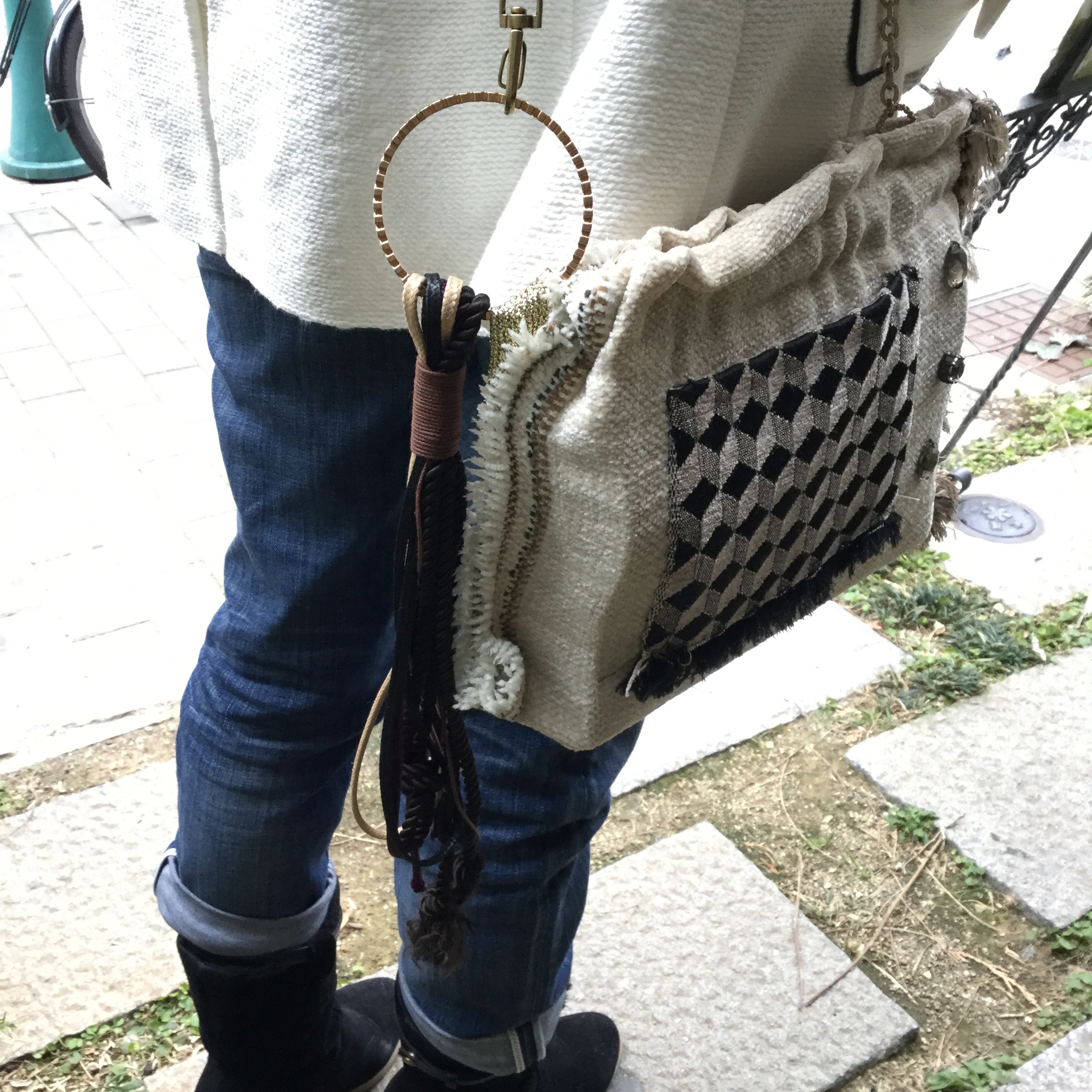 ミラーをご購入いただいたお客様がリサブレアの端切れでこんな素敵なバックを作られていました。アイデアとセンスがものを言います。チェーンの取っ手にはブレスレット、片側は切りっぱなし、片側はザックリしたフリンジ。何てオシャレなんでしょう。また身につけられていたアクセサリーもすべて手作り。ほしくなってしまいます。なかなか作品ができないとか、でもきっといつかリサブレアで販売会をしたいです。5月かな。その時には屋上でチョット変わったオシャレなガーデンパーティーを開催する予定。