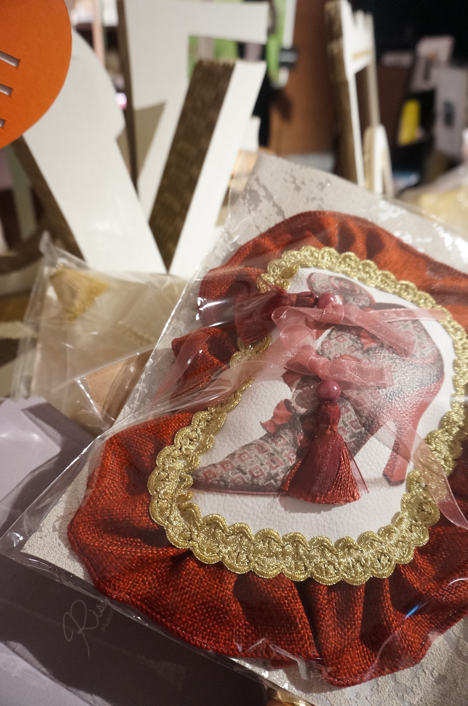 私たちはと言うと、オリジナル・リングピローを制作いたしました!インテリア用のクッションはつくりますが、リングピローは久々の制作となりました。コイケさんのリクエストに応える為、ウェディング・ボードに合わせたカラフルでPOPなアイテムをつくろうと決め、残布やタッセル、クリスタル、リボンとあらゆるアイテムを机に並べ試行錯誤しながらつくった世界に一つしかない手作りリングピローになりました⭐︎ 心を込めてつくった、いかにもリサブレアなリングピロー(笑)