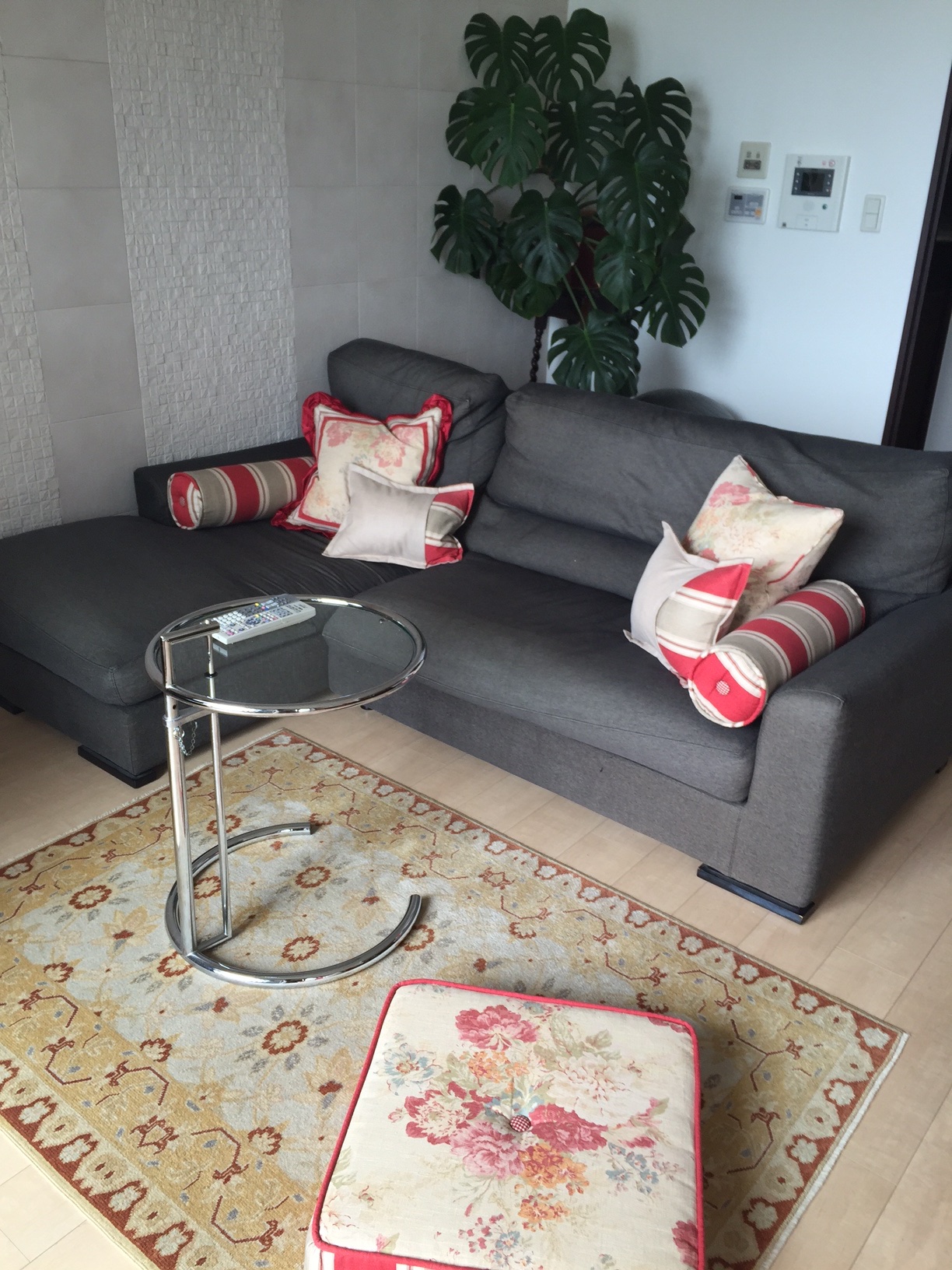 シックなインテリアに、カーペットやクッションに花柄を入れる事によって、とっても暖かみのある空間に!手前も大型クッションもとっても素敵です。赤が入る事により鉢植えも浮き上がります。
