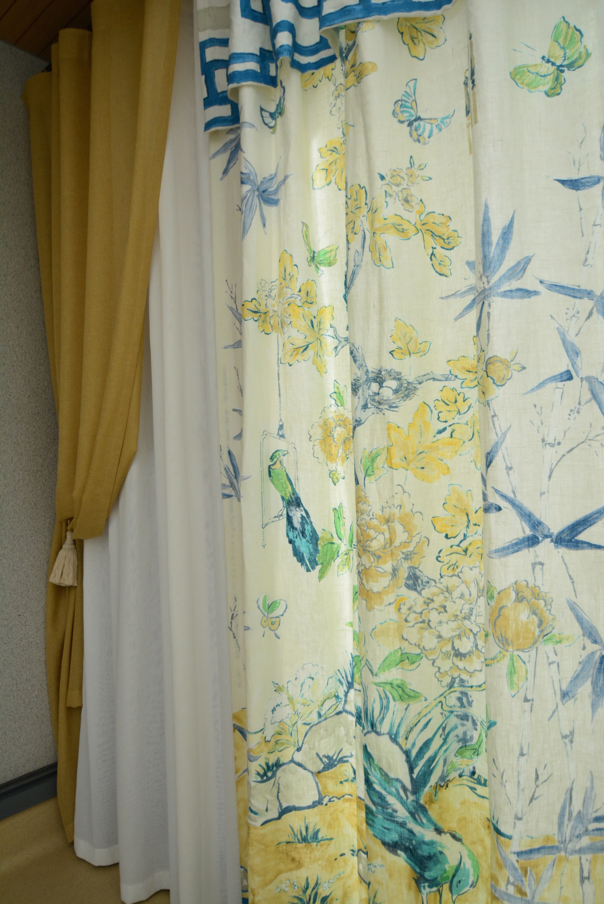 ご提案させて頂いた生地はタイのNO.9 Thompstonのシノワズリ調の生地!素材は麻なので独特の優しさが出ています。パネルになっており、幅137cm高さが2m40cmのデザインとなっております。この生地は角の部分にアクセントとしてレイアウト。プラスしたのが、左に見える同じくタイのPASAYAです。マスタード色のレースが、角の寒々しさを隠してくれているので、空間としての世界観が出ております。