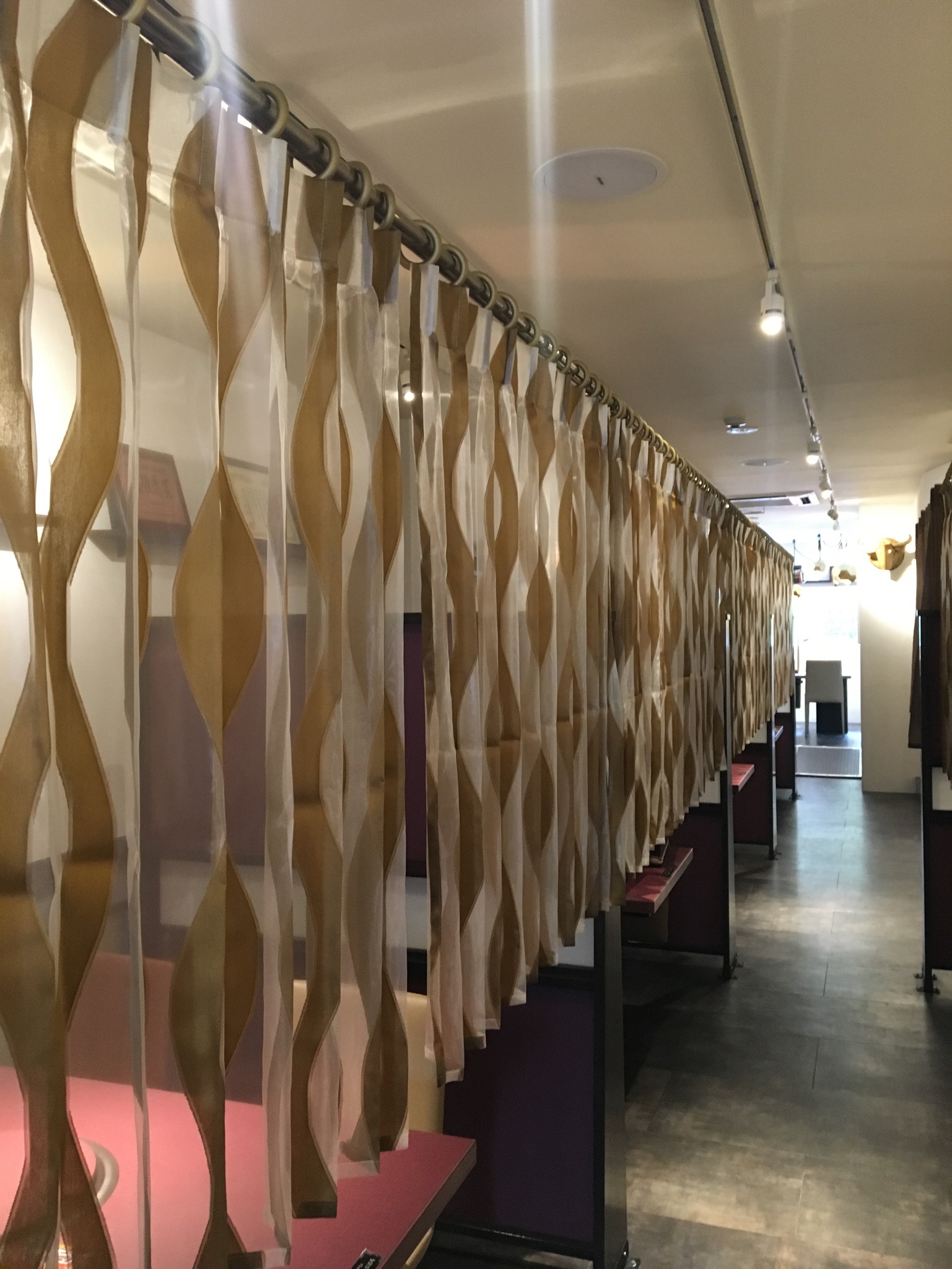 先日、三宮東門街の焼肉屋さん「神戸たん龍 東門店」様へ、仕切りカーテンを納品させて頂きました。カーテン生地は日本フィスバ様取り扱いのFRONEシリーズです。