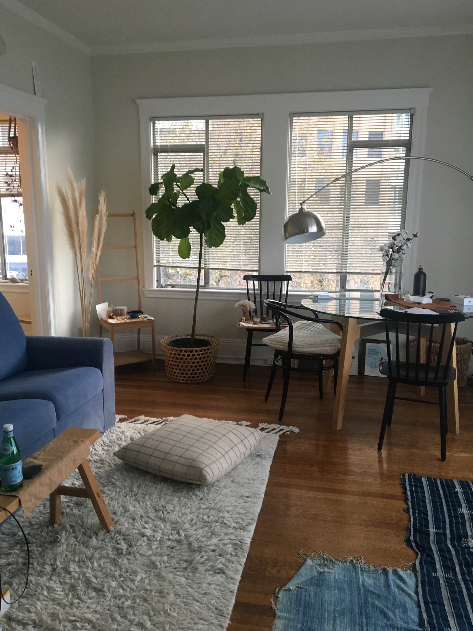 先ずは、私の友人のお家のインテリア。窓が大きく太陽の光がたくさん入ってくる気持ちの良い空間です。白い壁にグリーンや、美しい家具。そしてインディゴブルーのナチュラルな風合いのラグやソファが置かれているのですが、それが何とも心地良い空間をつくりだしています。