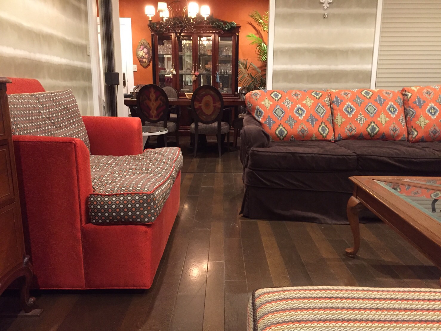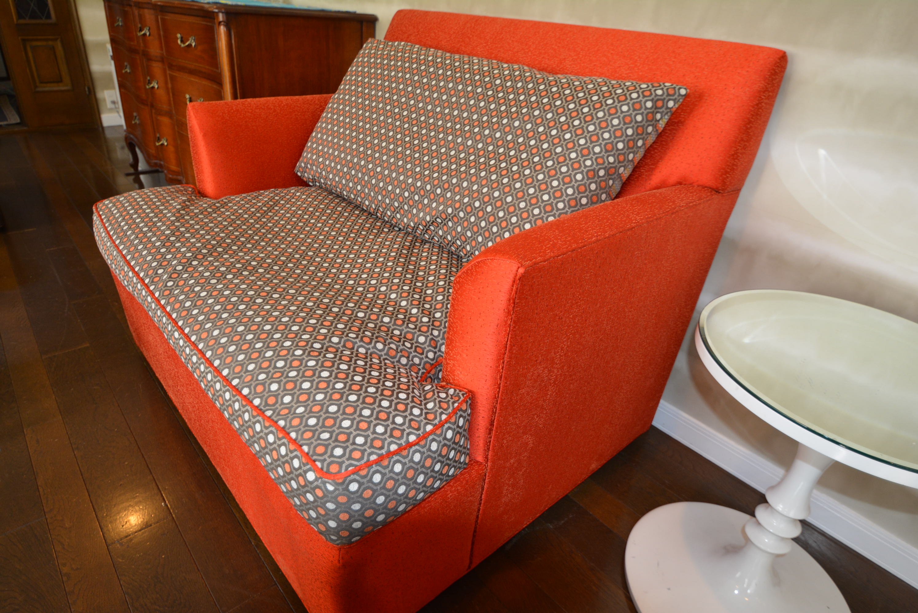 こちらのお客様のお家は、写真では見えませんがオレンジがアクセントカラーとして所々使われています。このソファとオットマンを貼り替えたことで、ダイニングからリビング全体に繋がりができました。2脚で4種類の生地を使い、パイピングの色を変えております。椅子張りは余り知られていませんが、デザインするポイントが沢山あったり、クッションと合わせていったり…本当に奥が深いのです。椅子張り生地は余り選べないのが悲しいのですが(価格が高すぎる・種類が少ないなどの理由)、弊社では直輸入してどこにもない椅子張り生地をショールームに用意しておりますので、お近くに来られる際は是非お越しくださいませ。