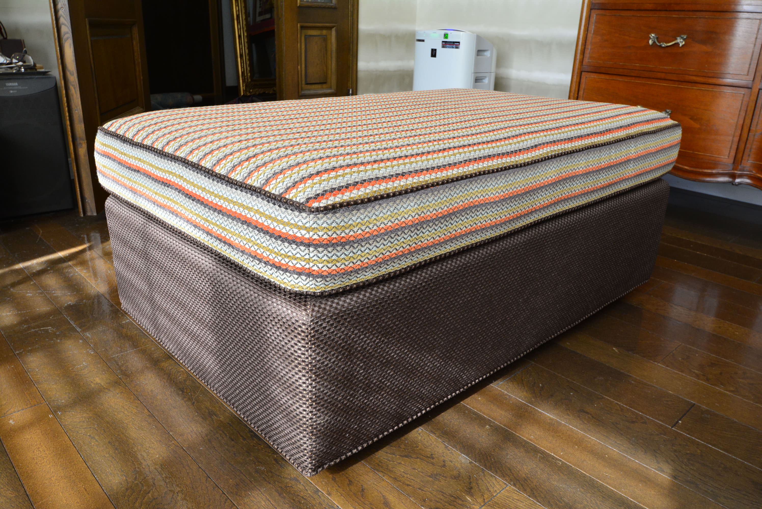 本日、新しい生地に貼り替えたソファとオットマンをお客様の元に納品させて頂きました。かなり大胆な生地の組み合わせです。見たときに思わず「わー!!」と声が出てしまう程、どこにもない素敵なソファとなりました。