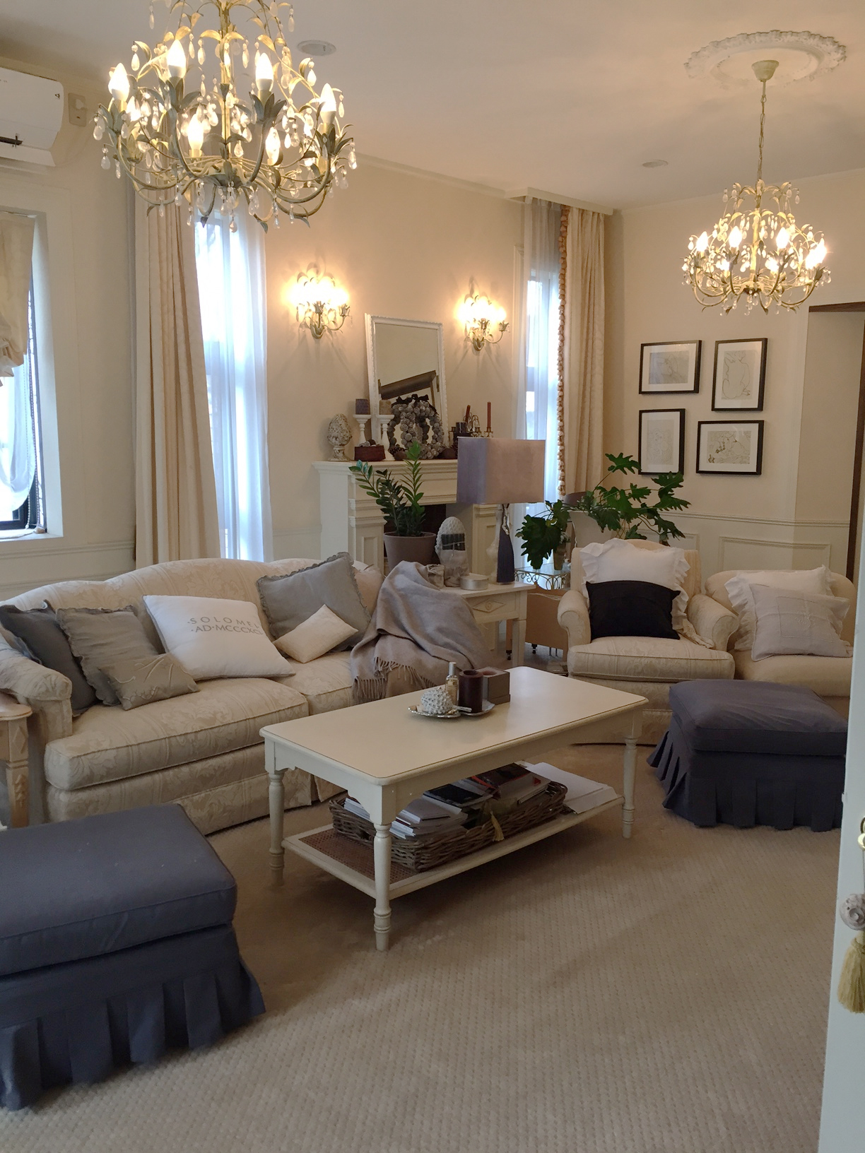 お客様よりとても素敵なお写真が届きました! オットマンカバーとレースカーテンを制作させて頂きました。 クッションなどの小物のコーディネートとの合わせ方もセンス良くコーディネートされているインテリアは見ているだけで幸せになります。クラッシックな雰囲気で、ベースのお色が統一されており、オットマンやランプシェードがアクセント(紺色〜紫色)になっております。N様、ありがとうございました⭐︎