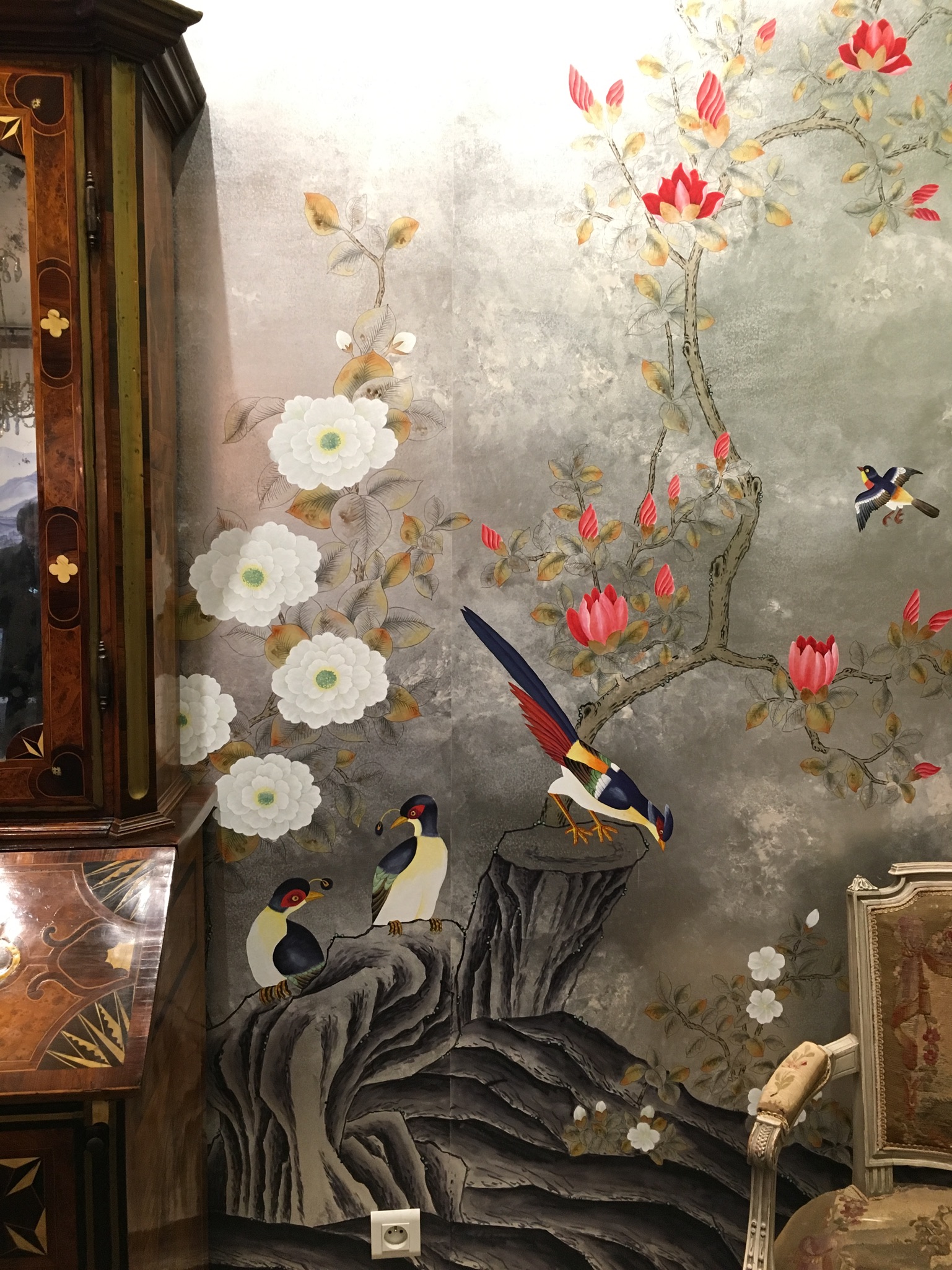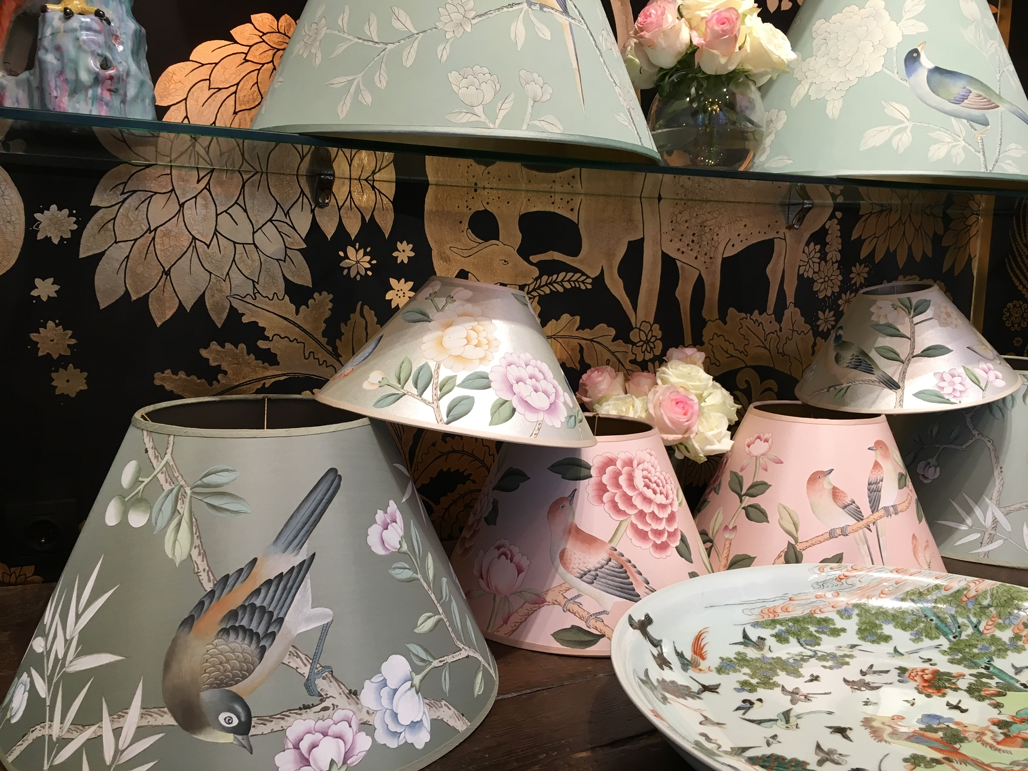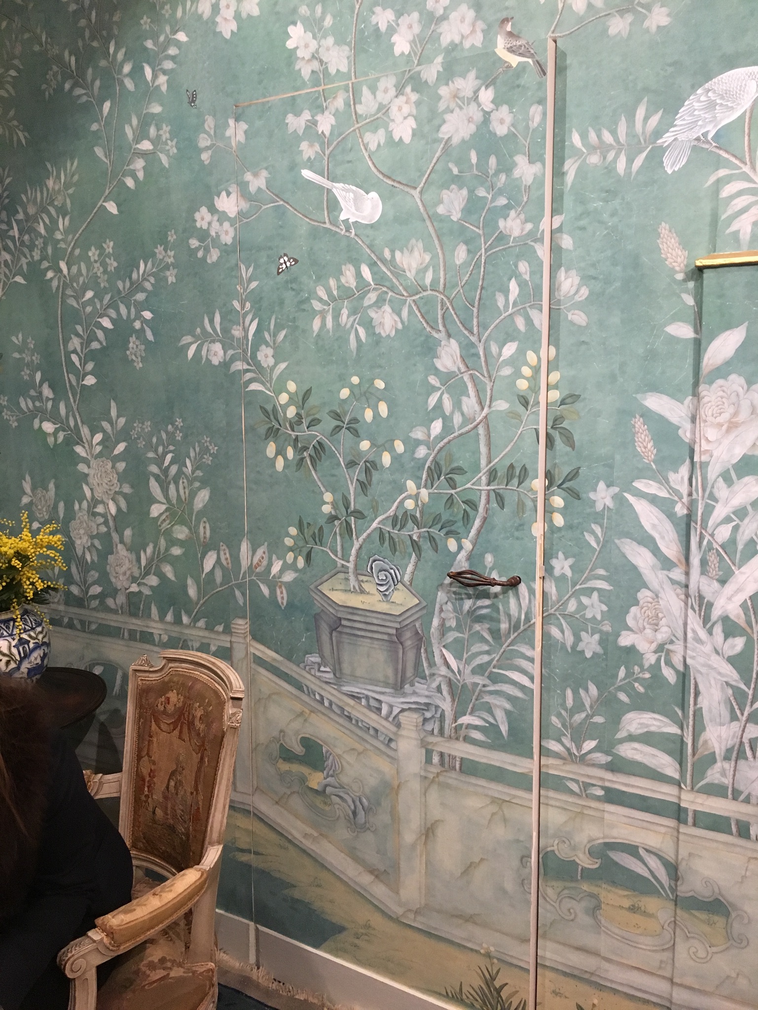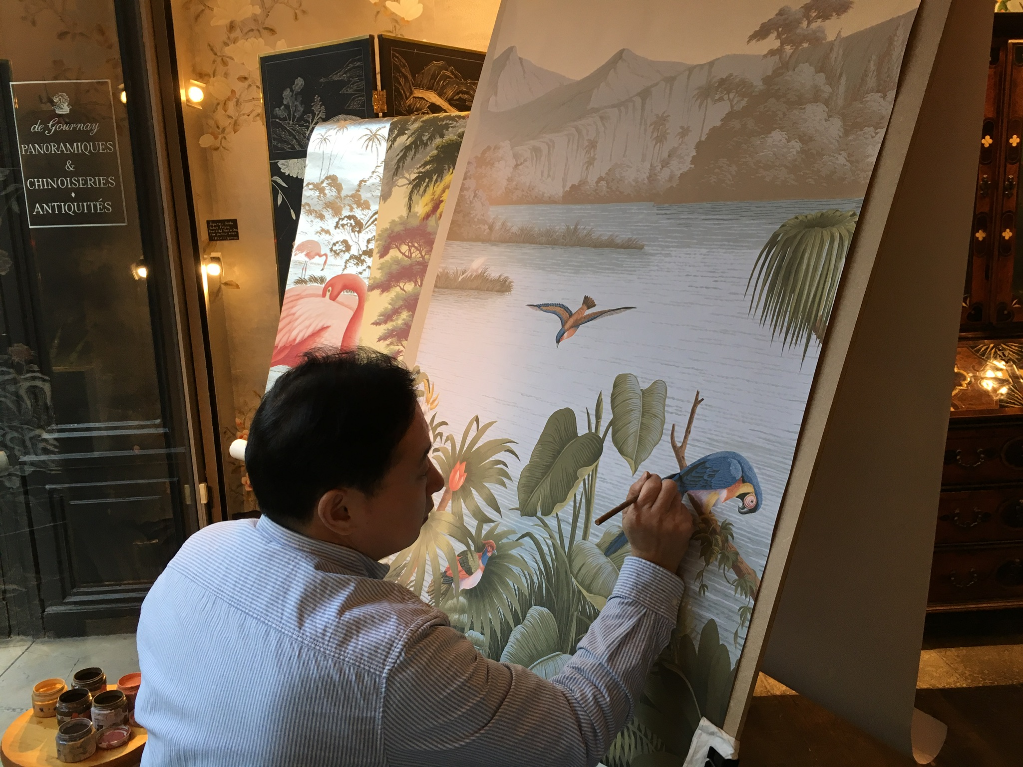 手描きのシノアズリの壁紙で有名なブランドです。デザイン、色彩がとても綺麗で、日本ではアパレルのお店等で稀に見ますが、欧米ではホテルやレストラン、雑誌で良く目にします。今回はイベントだったので、アーティストが実際に描くデモンストレーションをしていました。
