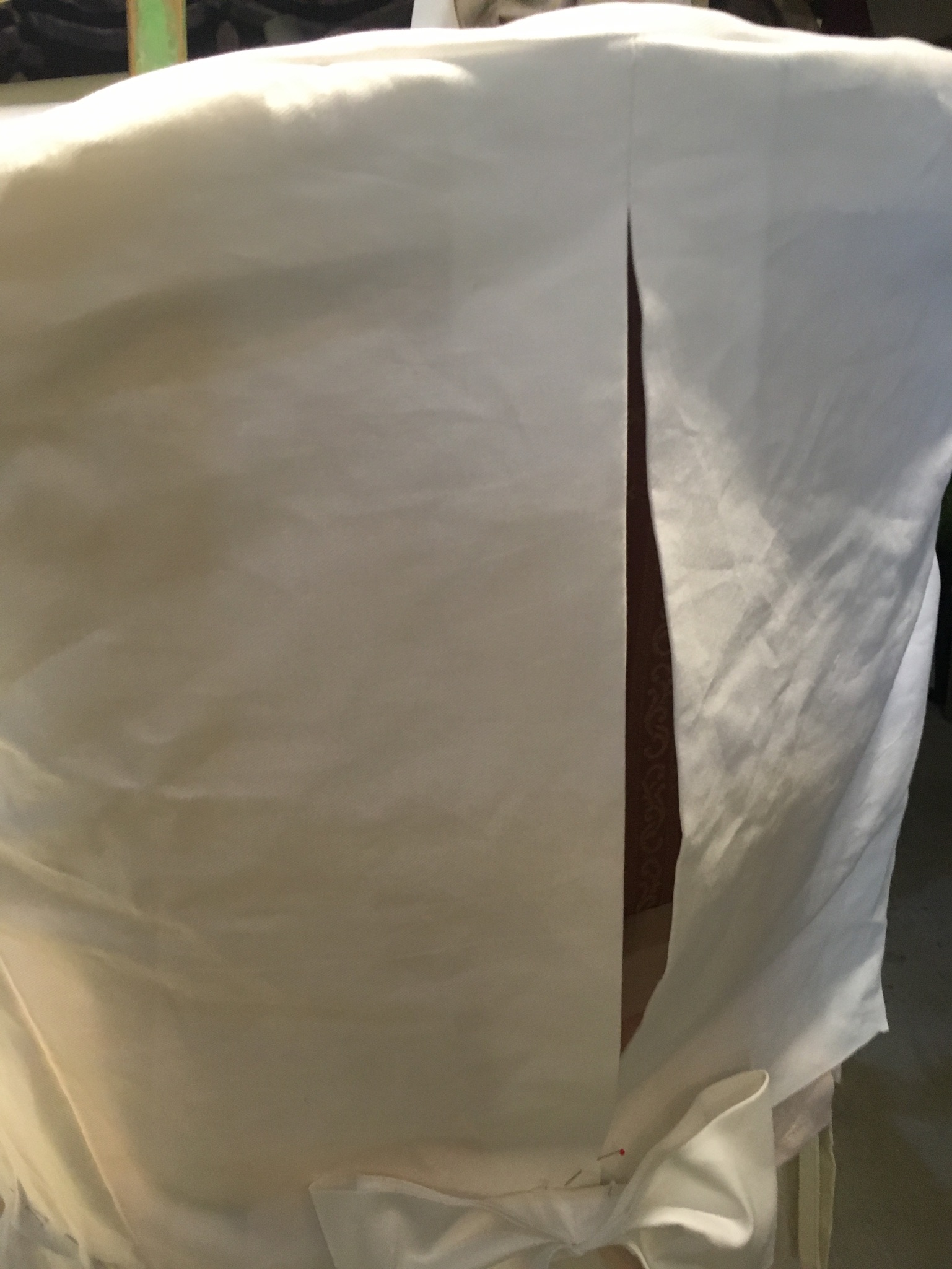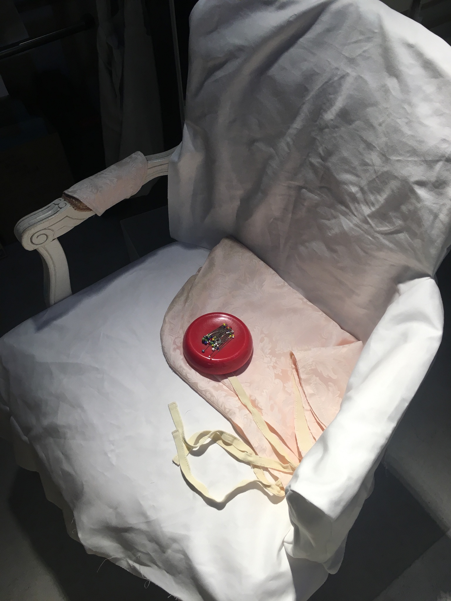 左側は椅子の肘掛けが見えていますが、このタイプのクラッシックな椅子は貼り替えをしてももちろん素敵なのですが、カバーを掛けると可愛らしい椅子に大変身します。白の生地は本番用ではなく、パターン制作時に使う生地。
