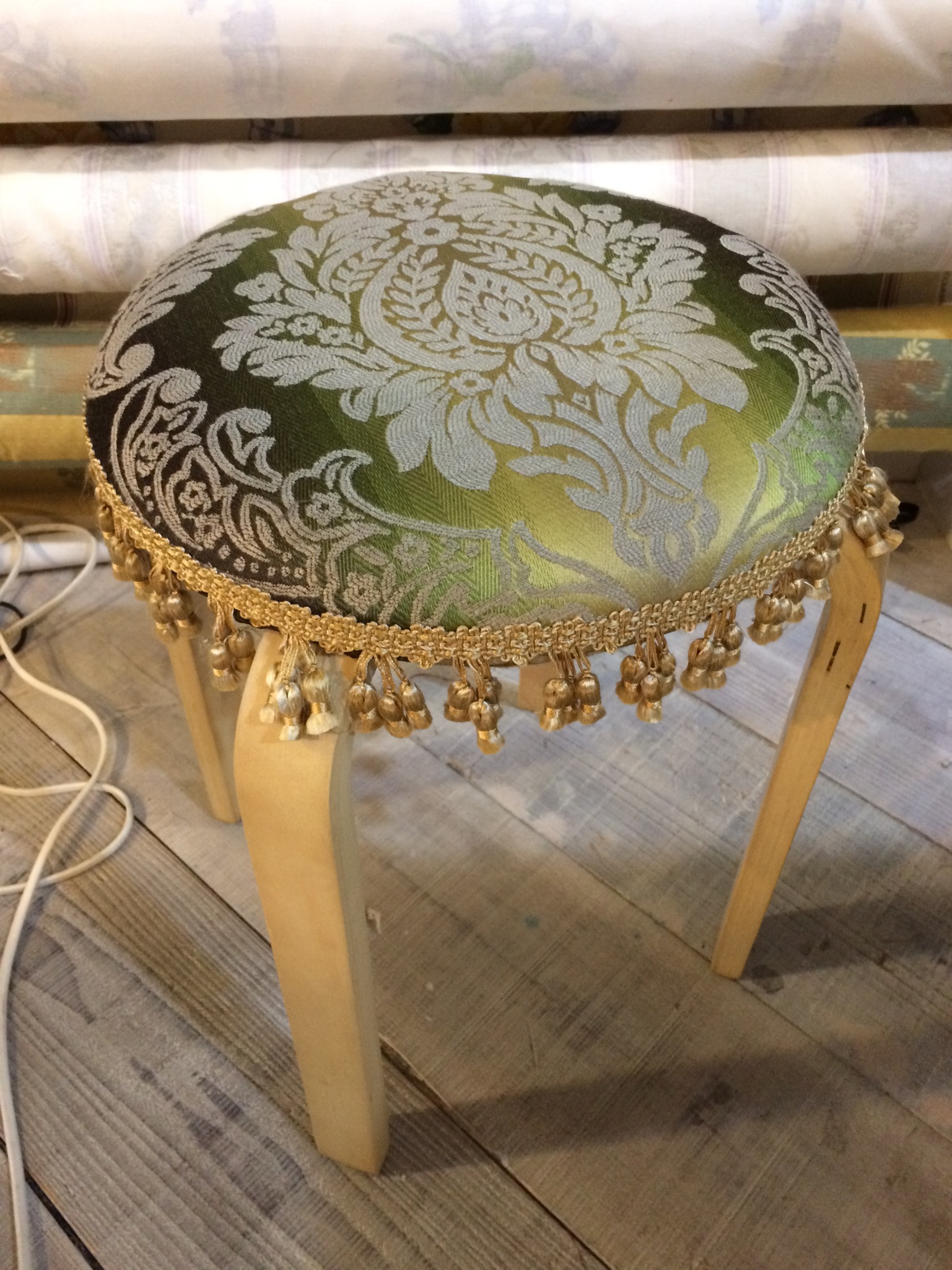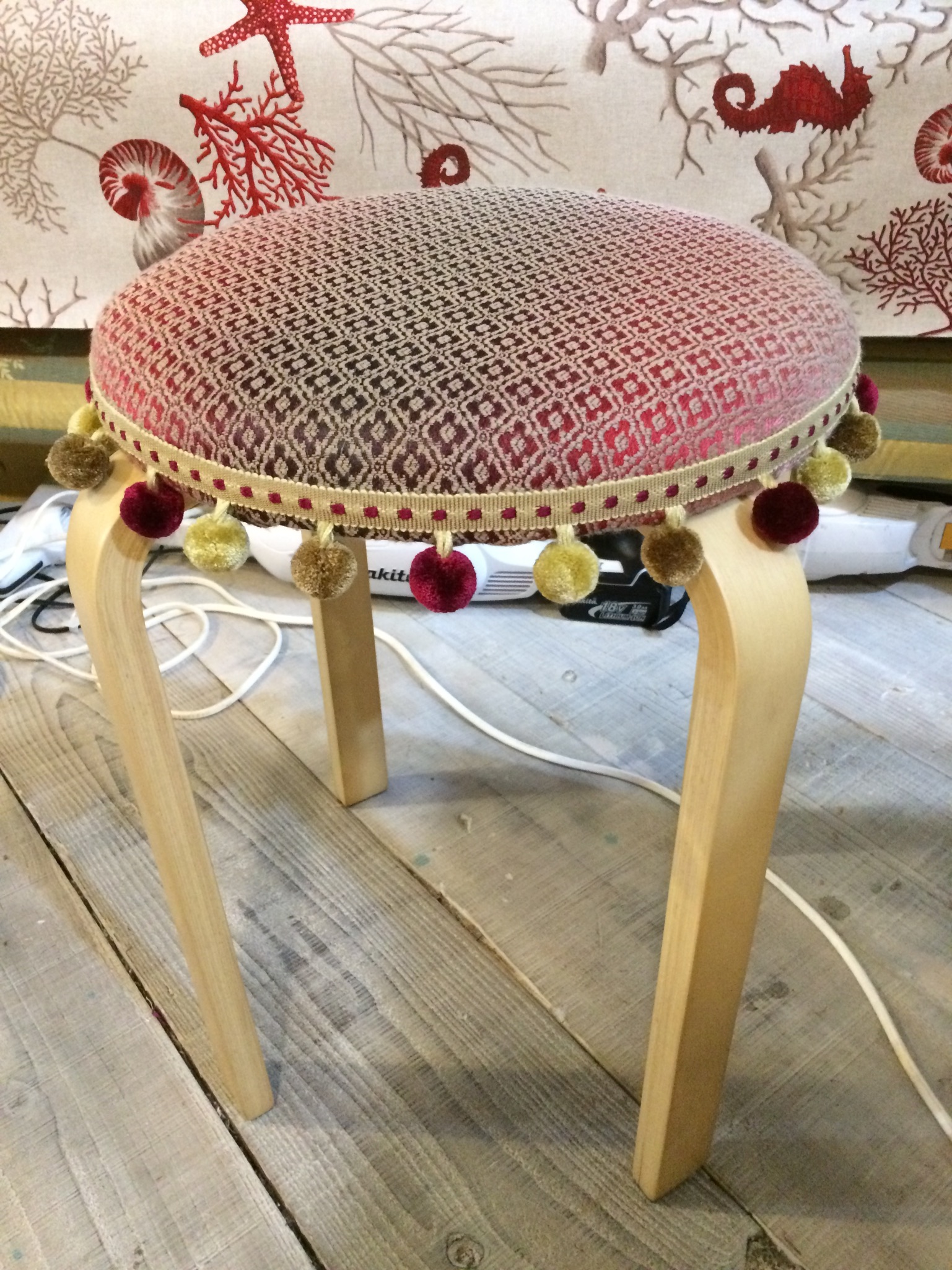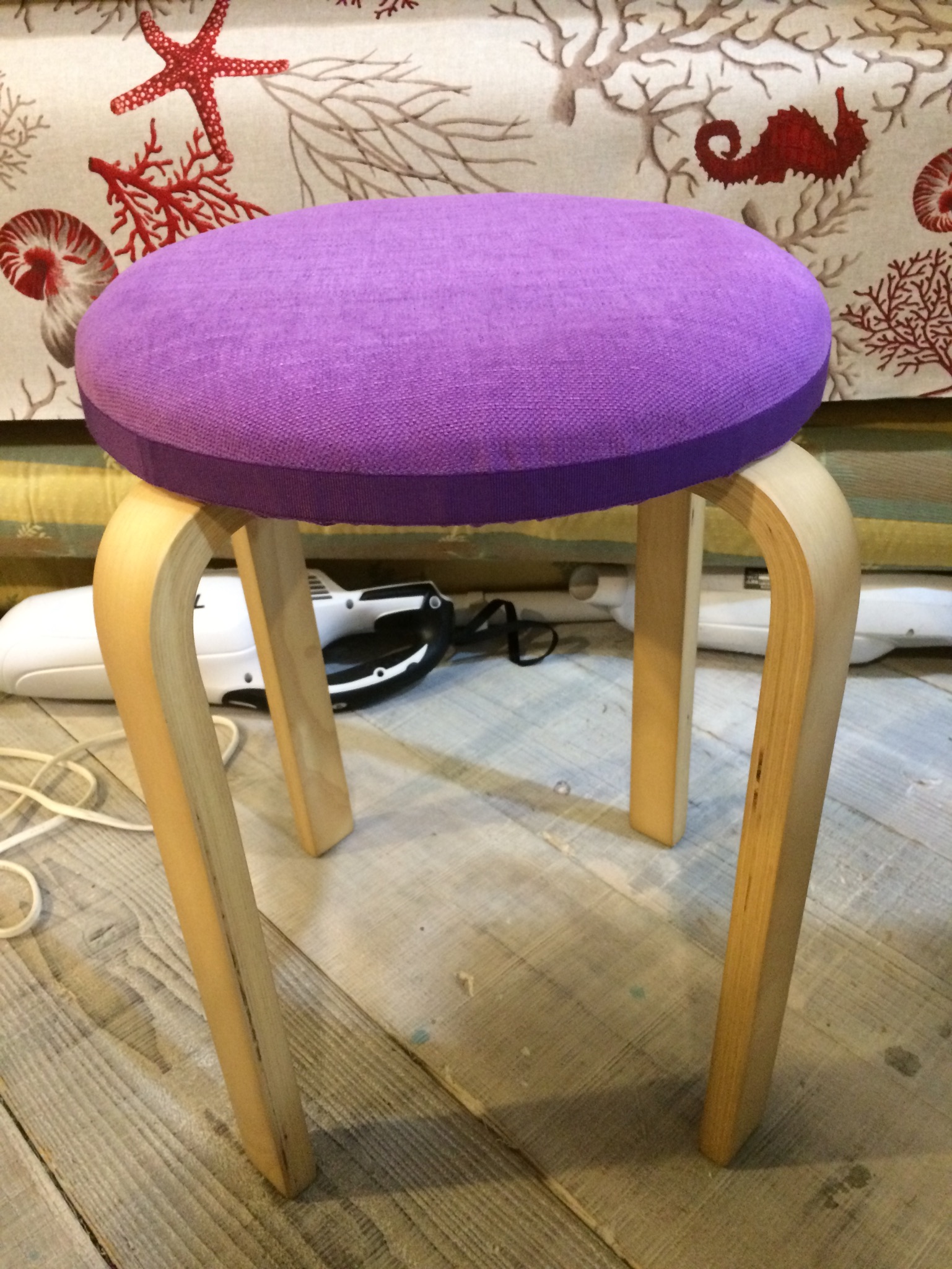 お気に入りのスツールをご紹介です!市販されているスツールにフォームを付けて椅子貼りをして生まれ変わるスツール達。