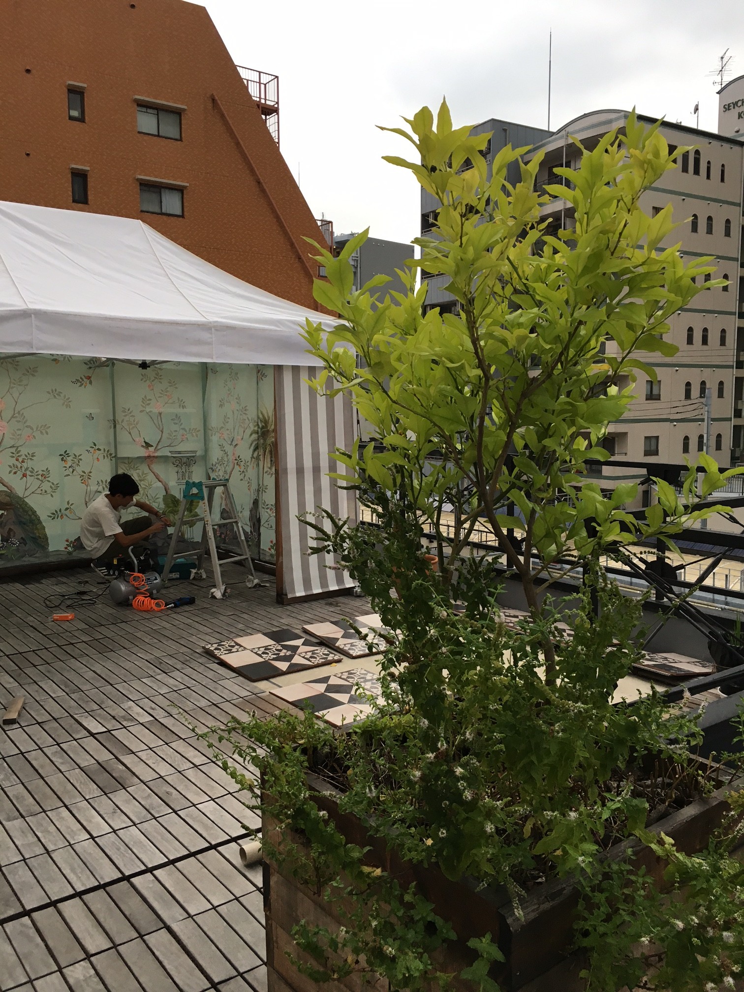 Midsummer Night’s Dreamのイベントに伴い、1年ぶりに 屋上のテントの飾りつけをしました。前回、グランピングのイベントで設置して以来、約1年ぶりの飾りつけです。テント内のデザインは当社のデザイナーの石川リサが、このイベントの為に新しくおこしたデザインです。クロシェさん共々、ご来店お待ちしております。