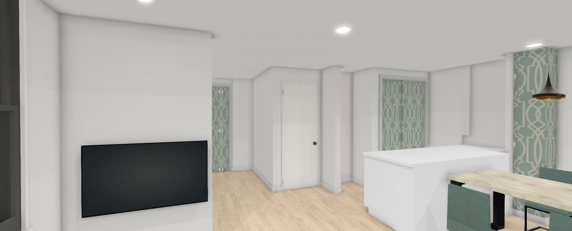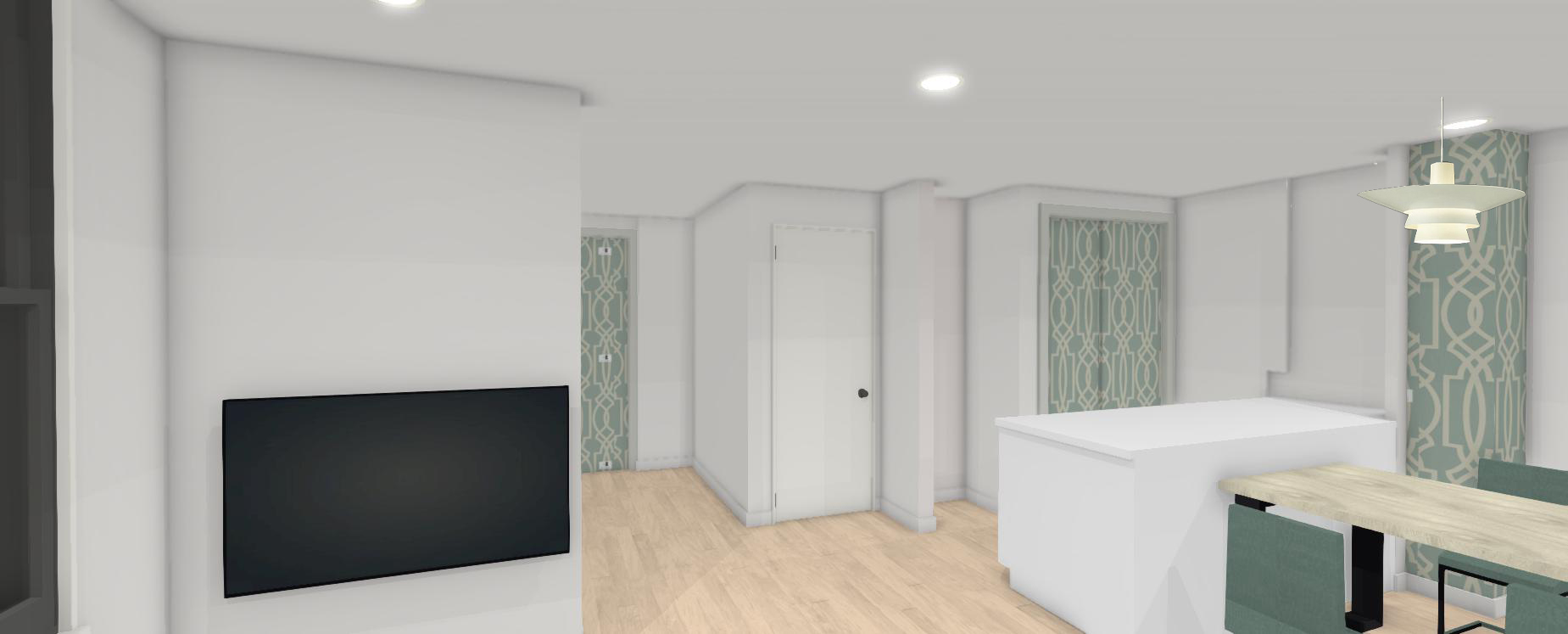 石川安江です。マンションリフォームのご提案をさせていただいてます。新築のマンションのリフォームもよくさせていただくのですが、和室を洋室にというケースが多いのです。家具のレイアウトを考えながらテレビの位置を決めて、ご主人様の書斎コーナーの確保、さらにキッチンの収納を合わせてつくります。収納には輸入壁紙を使用し、お部屋のアクセントになりながらも使いやすさを考えます。今回の場合は初めに選んでいたものを画像にしてみると、ちょっとさみしい感じに。 次のご提案としてはブルーグリーンの色のジオメトリック名壁紙をお勧めしています。引き戸にして、中の棚を稼働にしておくと中が一度に見渡せて、扉収納より使いやすさは各段あがります。そして引き戸のまわりには必ずケーシングが必要です。これがなければただの押し入れ扉になります。ケーシングをつけるだけでこんなにも変わるなんて優れモノです。まだご提案段階ですが、照明もインテリアのポイント。どれをつけたらいいかなと画像で確認するとイメージをとってもらいやすいので、ちょっと冒険でも大丈夫。今回はわたしの大好きなトム・ディクソンのペンダントがどうかなと思いますが、北欧風のペンダントも似合います。