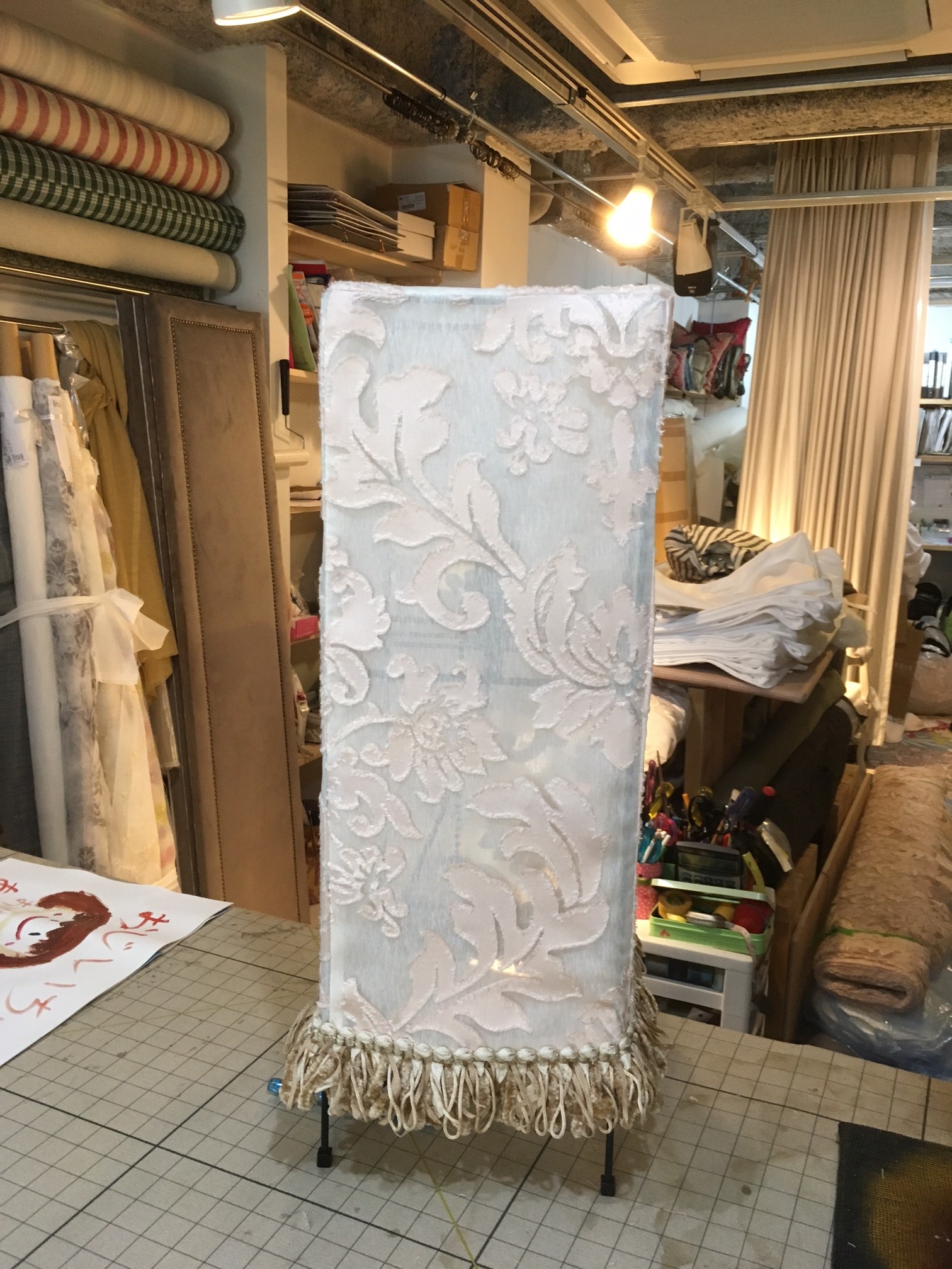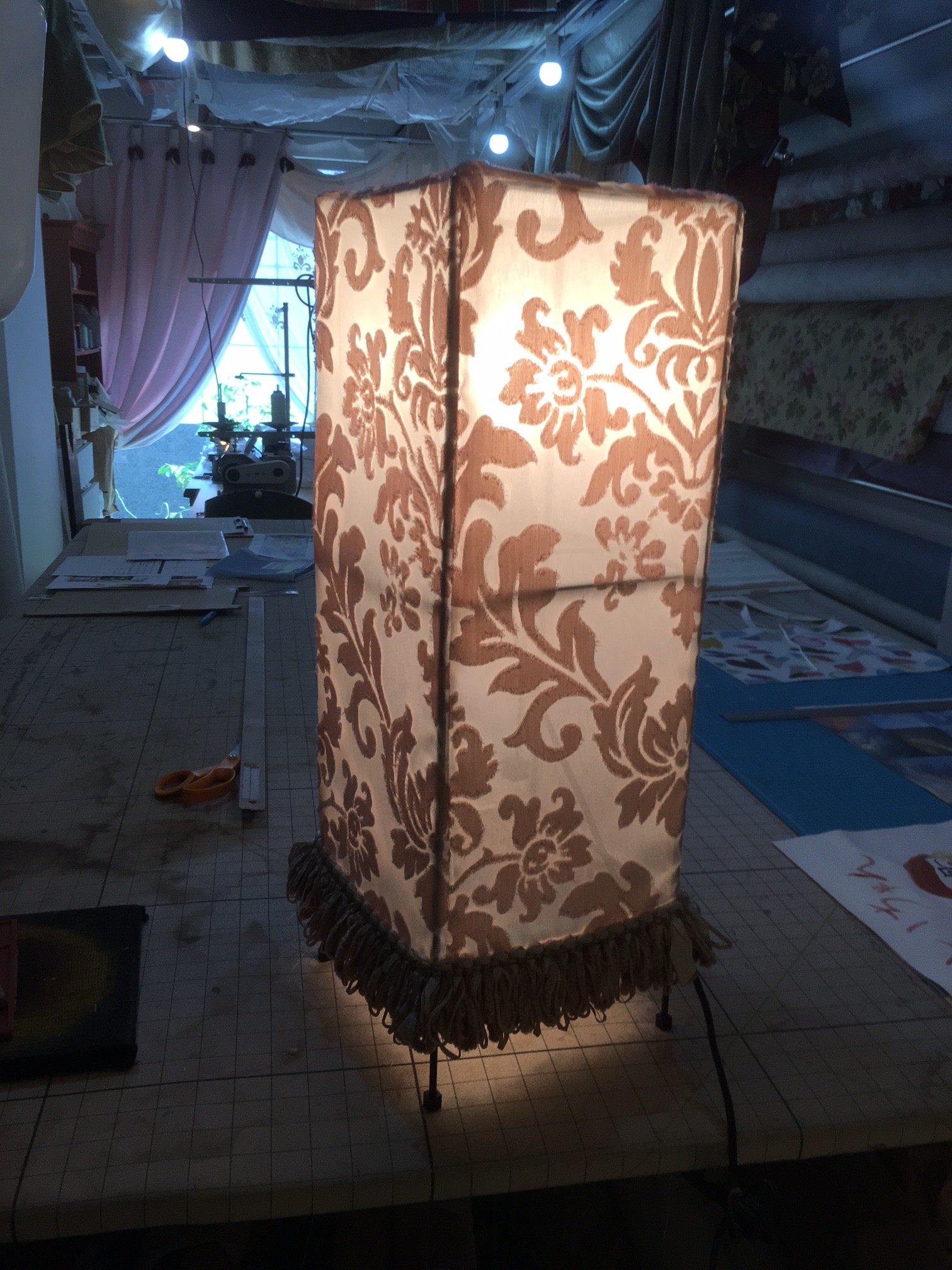 灯りを入れるとダマスく柄が浮き上がってとても素敵なシェードになりました。
