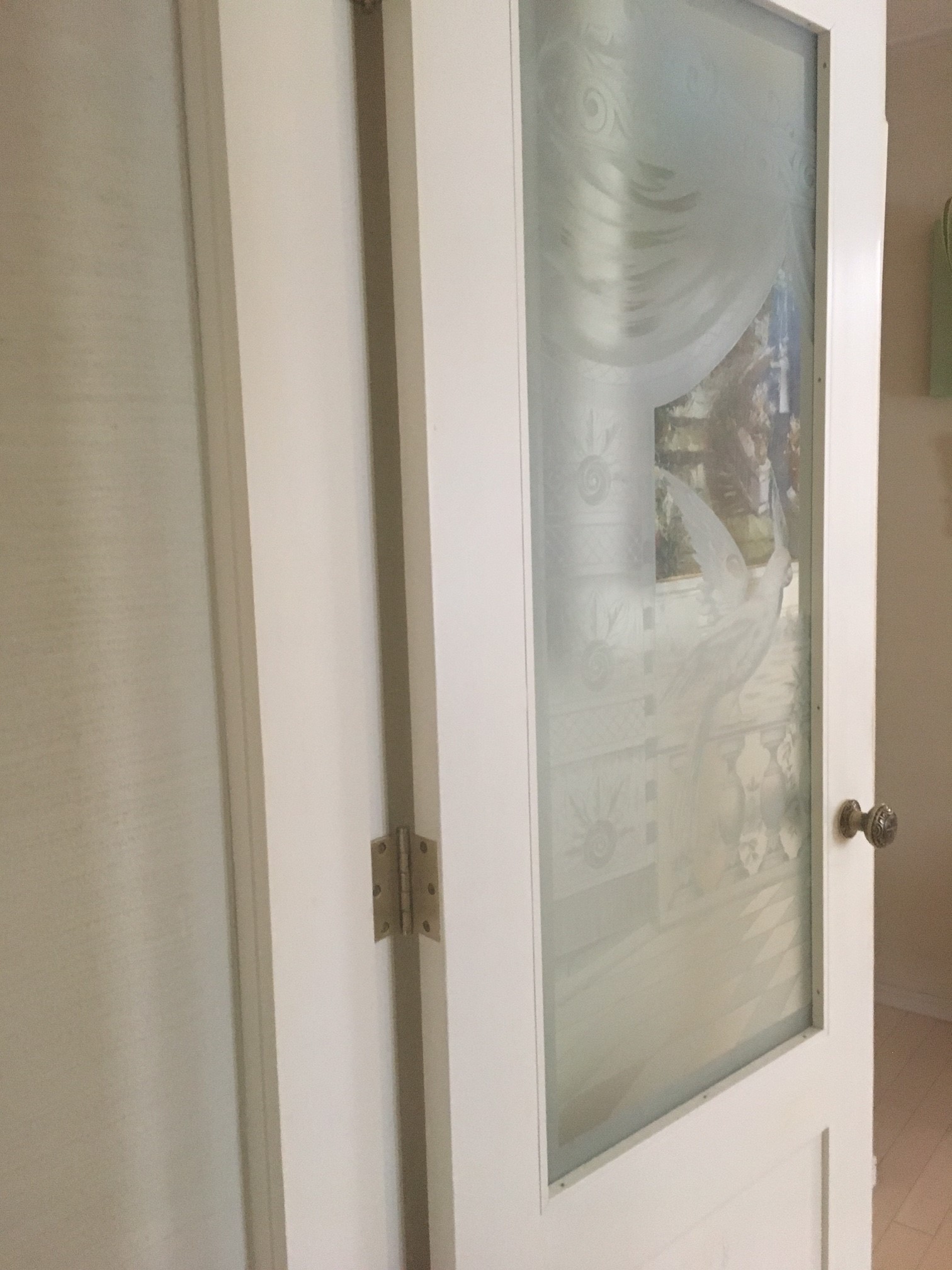 すわっぐと鳥のモチーフで、ここに隣り合うところにはタッセル柄のエッチングガラスです。