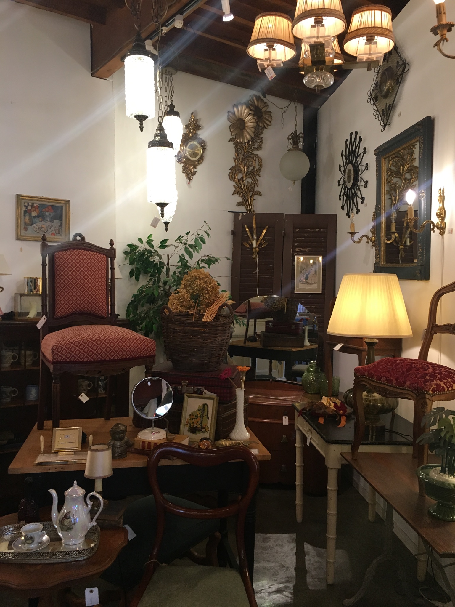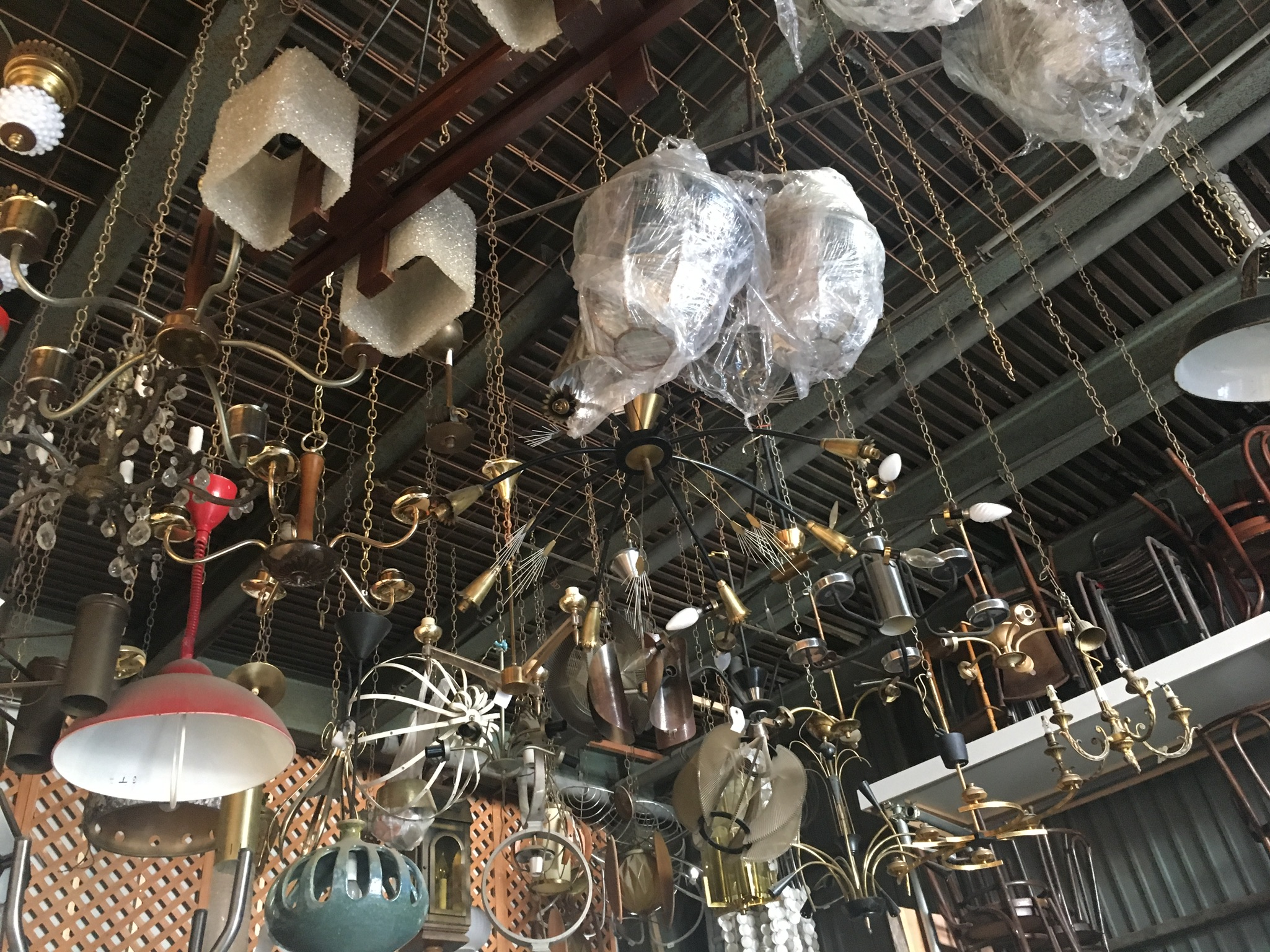 天井から吊るしてあるこの照明。修理待ちの商品らしいのですが、乱雑に吊るされた中からお気に入りの一品を探すのが楽しいんですよね。奥に見えているのは、同じく修理待ちの椅子。