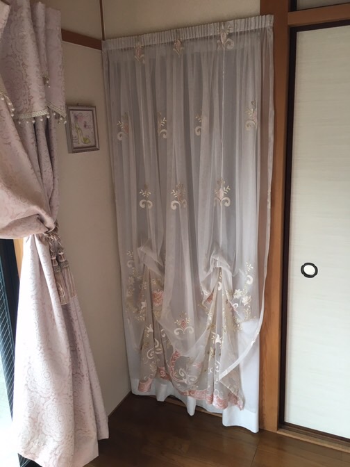 隠したいのだけれども圧迫感のある物は避けたいという事でレースをバルーンに仕立て、目隠しの為もう1枚奥にレースをどちらもテンションで取り付けました。