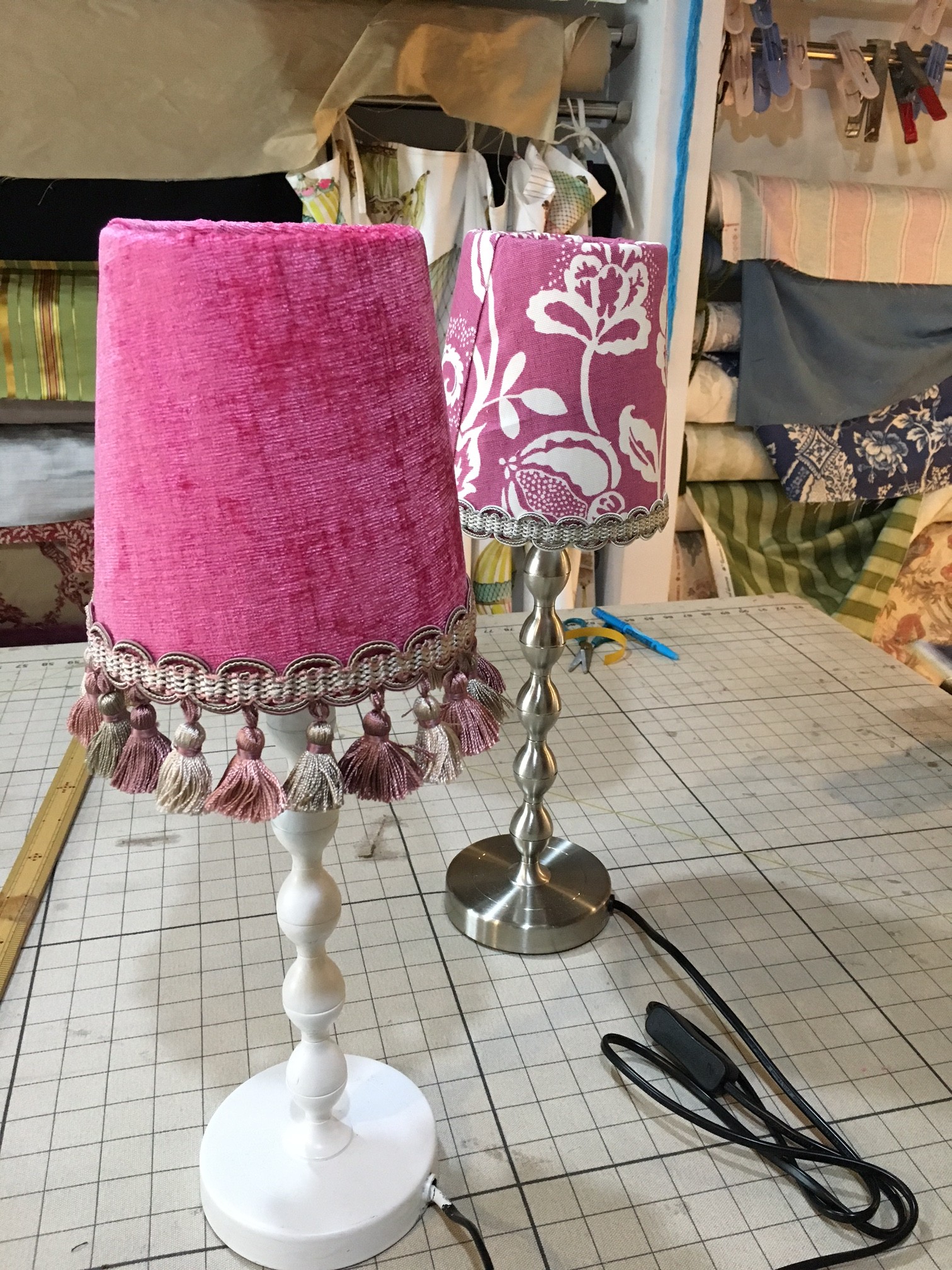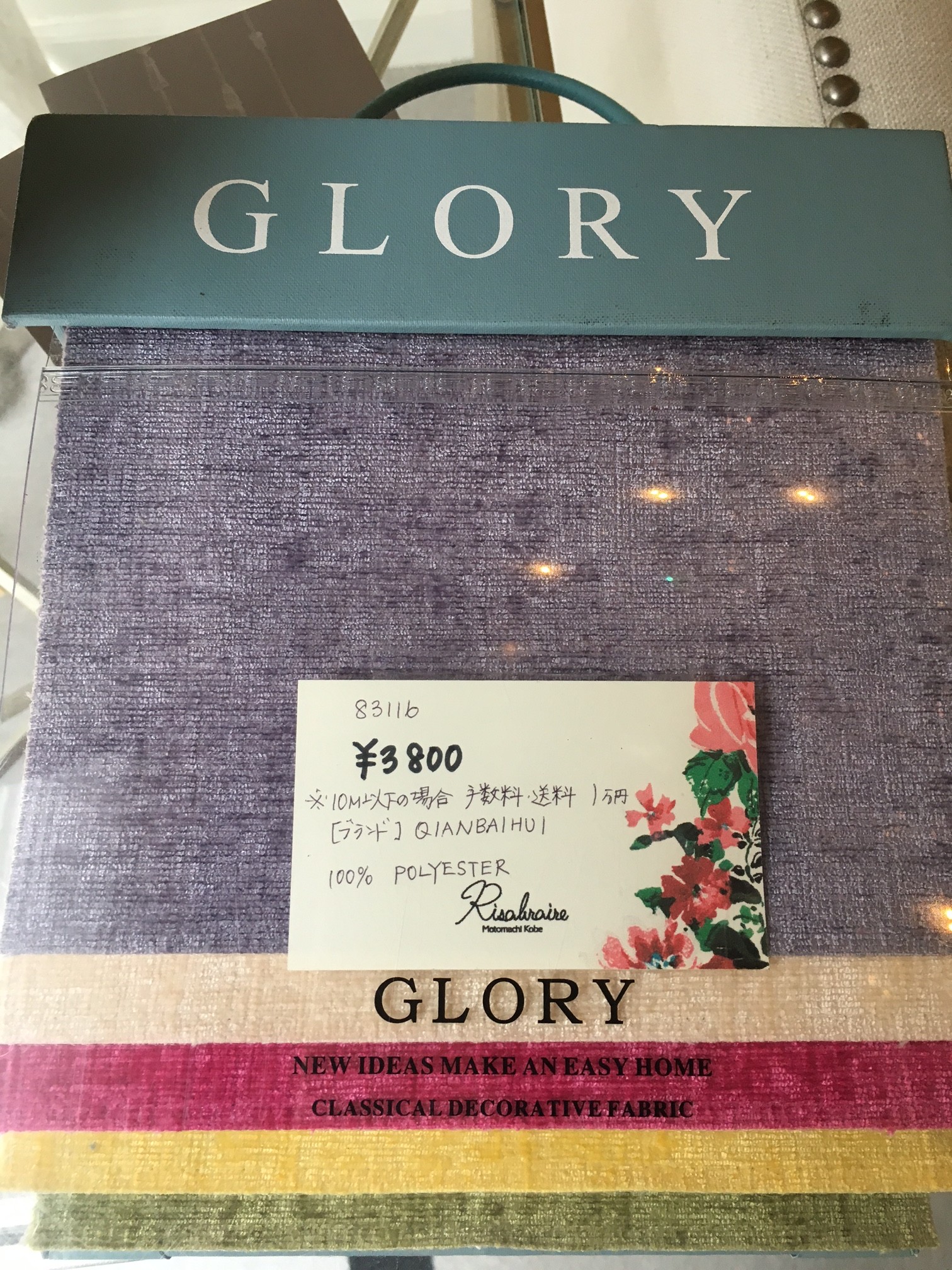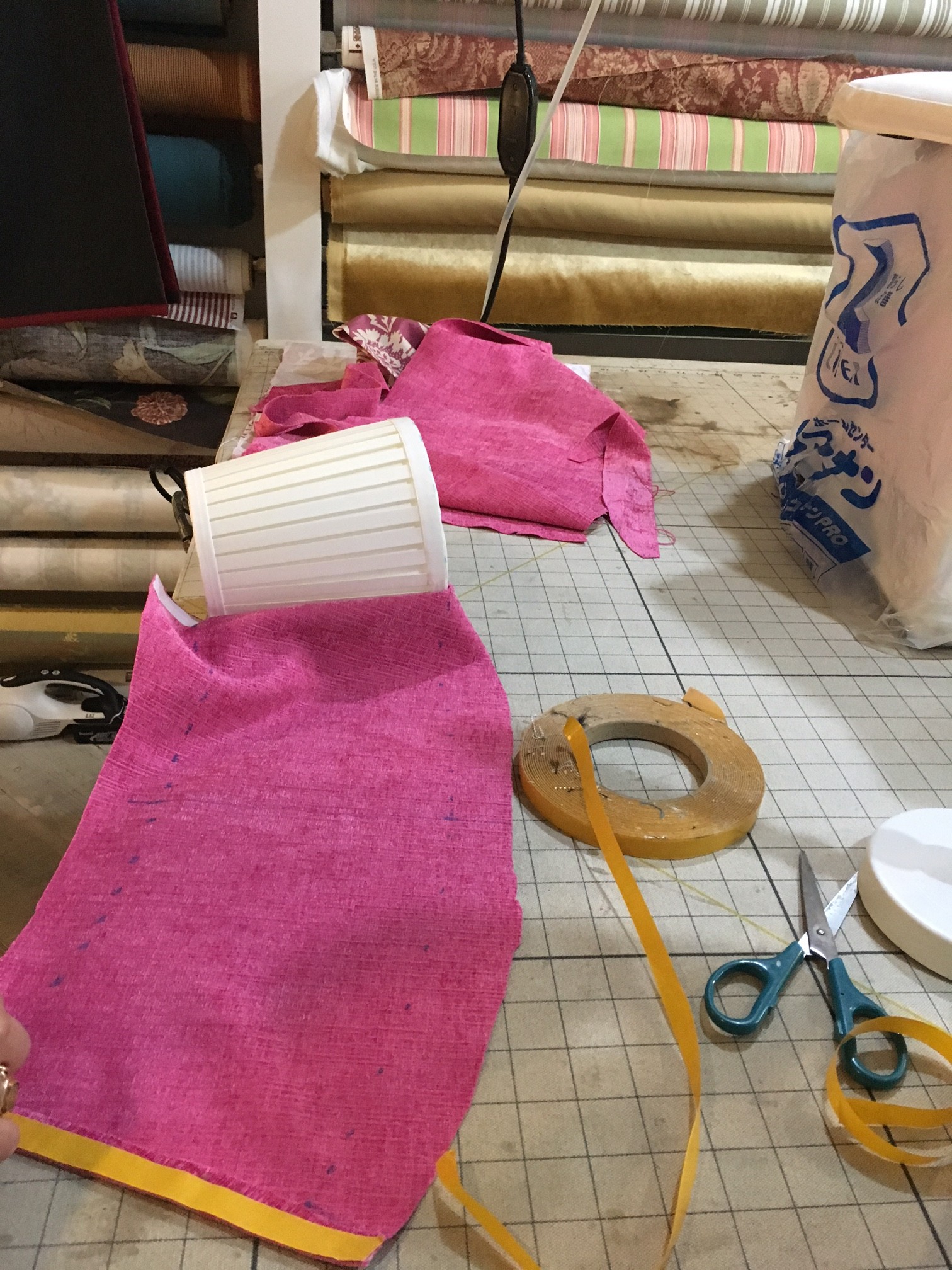 今回フューシャピンクのランプシェードに使用した生地ですが、こちら御値段の割にはドレープ性が良くカーテンはもちろん椅子張りにも最適!44色の多色展開。きっと気に入った色目も見つかると思います。