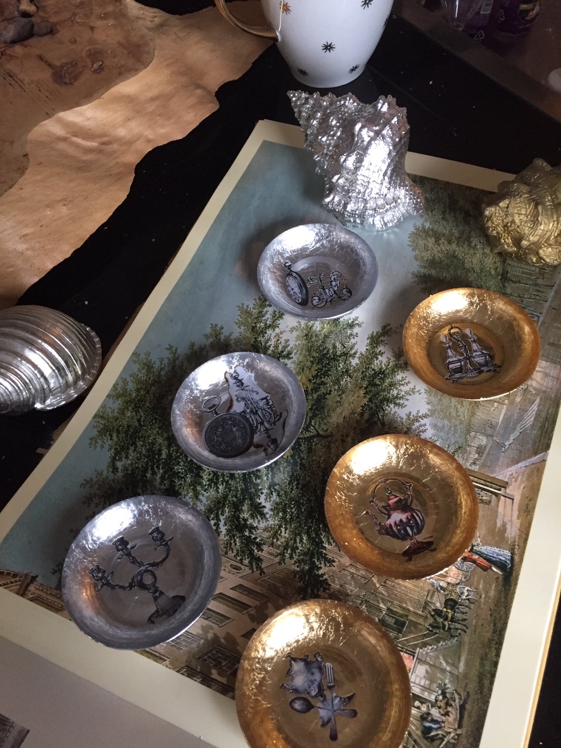 こちらの方は、どうやらテーブルアイテムでモチーフを揃えられたようです。キャンドルスタンドにポット、調味料スタンドなどなど… 見ているだけで楽しくなりますね。ほとんどの方がゴールドとシルバーを3枚ずつ作ることが多いですね。