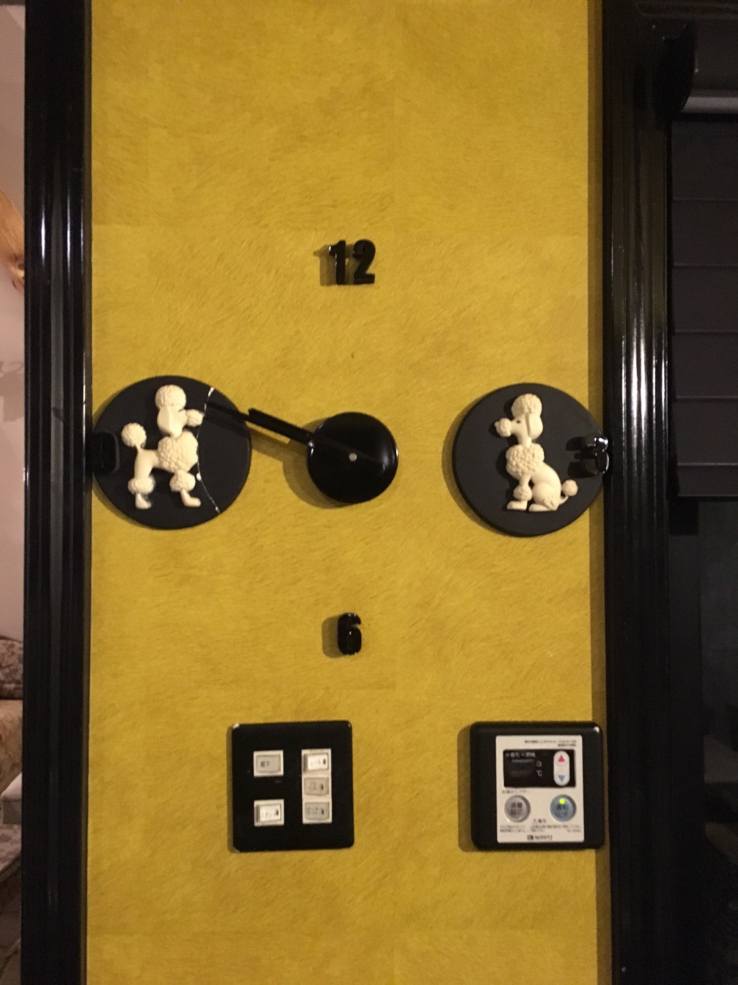 我が家にはかわいい花ちゃん(芸名るるチャン)というプードルがいるので、プードルグッズに少なからず興味が。スタッフがお皿で時計をつくるということにトライしていて今いろんなお皿を集めてそれを文字盤に使うという作業をしていますが、その時見つけたのがこのプードル。そしてうちのキッチンの時計に無理やりくっつけました。でも大事なプードルがつける途中で割れてしまい、かろうじてくっついているという感じです。