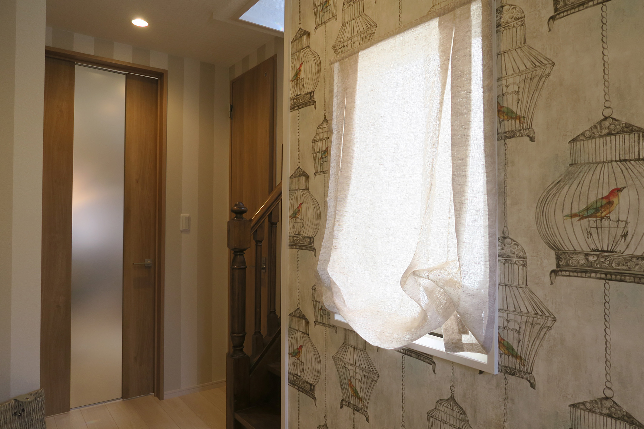 以前、事務所のカーテンをさせて頂いた地元密着型の工務店の女社長・大山様(神戸三晃設備株式会社)より、お客様ご自宅のカーテンのご注文を頂きました。壁紙に合わせた少しロマンチック且つナチュラルなテイストで、小窓を隠したいとのご依頼でした。