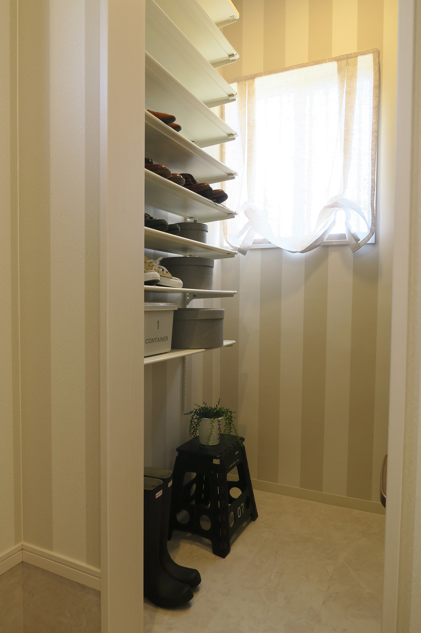 こちらは、シュークローゼットの小窓です。こちらも同じ生地で制作させて頂きました。専門的な知識をお伝えしますと、ブサッティの生地は通常のカーテン生地と違い、幅が広いので、小窓ですと2枚分取る方が、生地を無駄なく使うことができます。リサブレアでは生地を最大限有効に使うご提案もさせて頂いております。