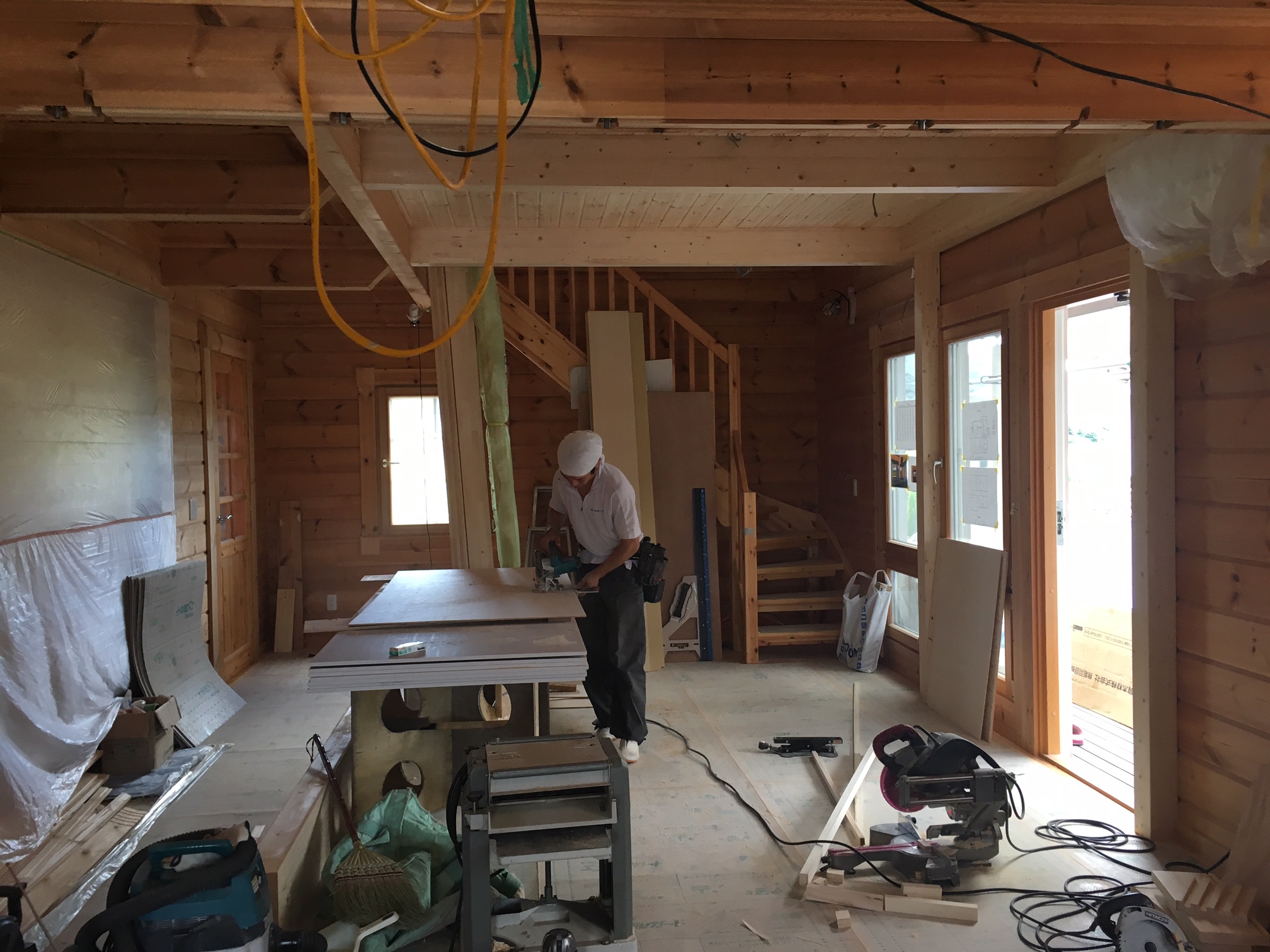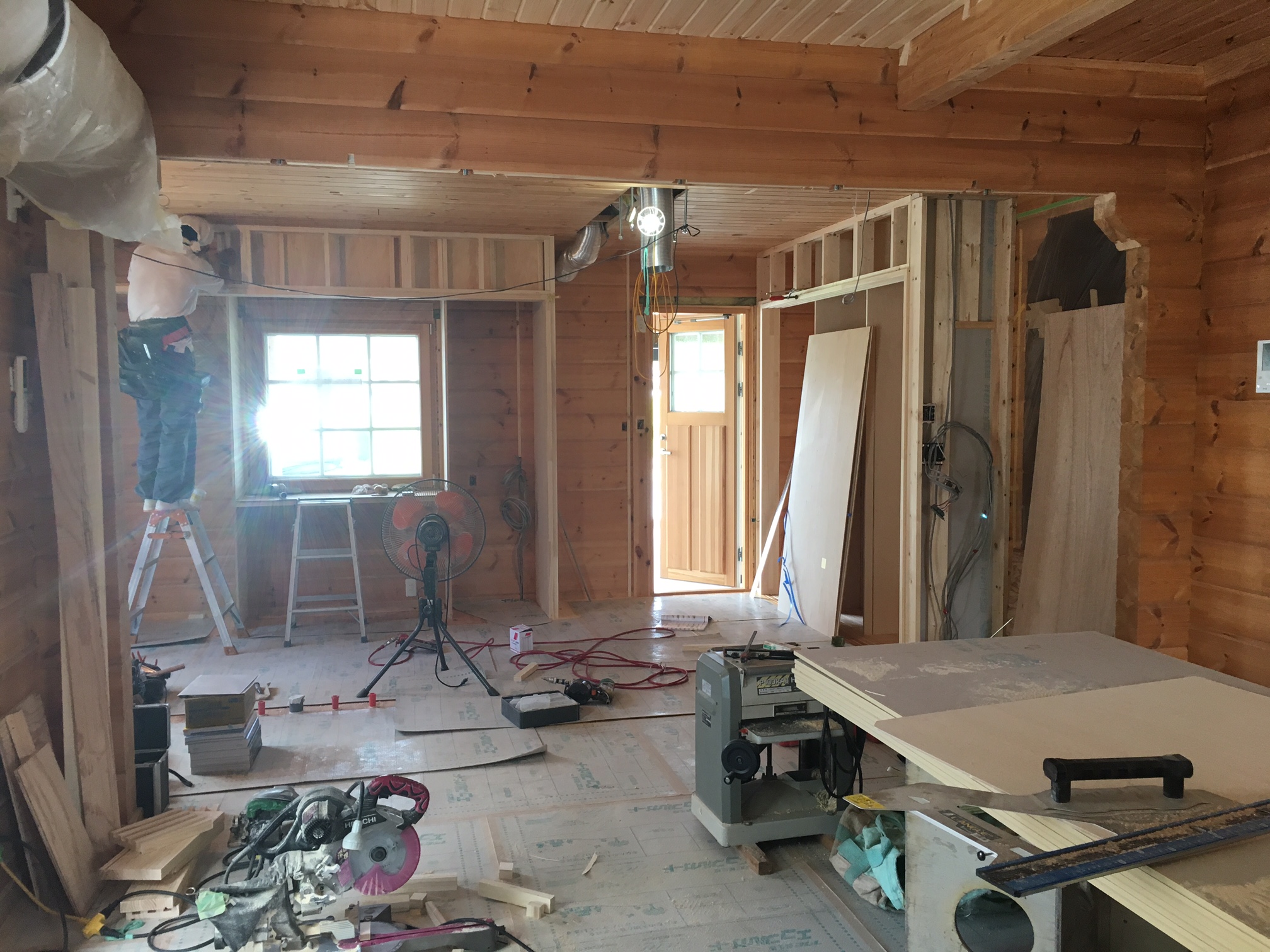ログハウスのリフォームですが、リビングの吹き抜けを閉じて2階にスペースをつくること、そしてキッチンを変えてしまうという目的です。クライアント様のセンスが個性的で普通ではないカラースキームでとても素敵です。一番の問題はキッチンの後ろ収納側に窓があるということ、この窓を生かすとなると通常のキッチンキャビネットをつけるという方法になってしまいますが。一番目立つところにキッチンキャビネットがくるのはよくない。 リサブレアのおすすめのキャビネットは大工仕事でつくる引き戸収納。いろいろなデザインができるしフォーカルポイントとしても使えます。いつもは個性的な壁紙を貼ることがおおいのですが、今回はクライアント様のご希望で塗装でパープル系。いいですねーーー。 特に考えたのが引き戸の大きさです。扉を開けた時には窓が全開で見えるということ、開けた時も締めた時も扉がアクセントになるというところです。扉の中から窓がでてくるなんてトリッキィーな面白さもある。照明の選択といいクライアント様のライフスタイルやセンスが光った住みやすいお家になりそうです。