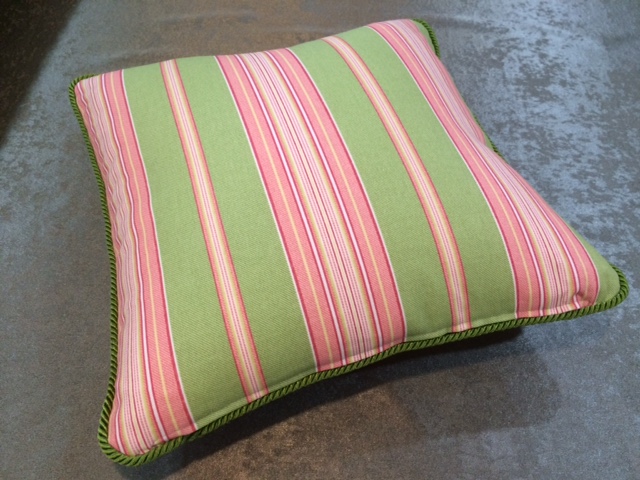 コードとストライプのグリーンを合わせたとても可愛いクッションに仕上がっています。