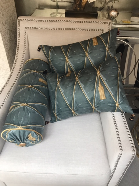 ボルスタークッションはゴールドのパイピングに、ゴールドのクルミボタンで、タッセル柄の色ととても良く合っています。