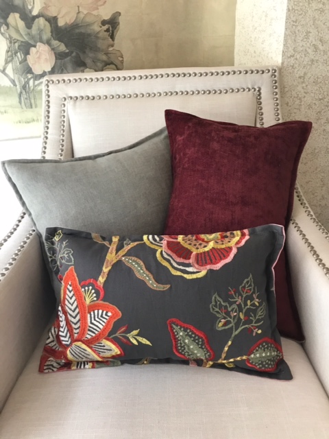 こちらもオリジナル生地で左の円柱型がボルスタークッションで、右が四隅にタッセルを施したプレーンクッションです。