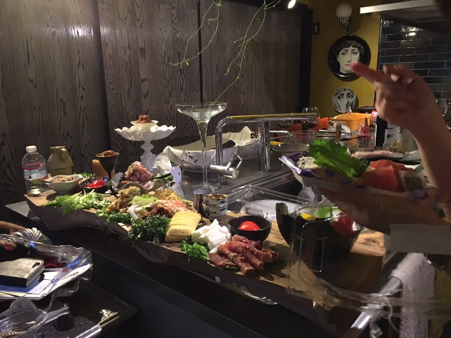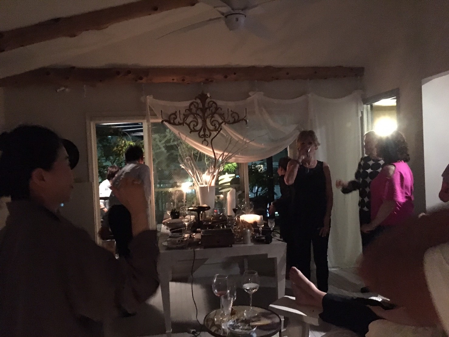 こちらは夜のパーティ!上のお料理はほんの一部、手巻き寿司です。たこ焼きにおでんも!弊社代表の石川安江と旦那様がお料理を気合いを入れて全て準備いたしました。ドリンクはワインとお酒、ビール。昨日のTOYO KICHENでのセミナーではゲストの方々のアメリカ的パーティの話を伺い、今夜は日本的なパーティでおもてなしさせて頂きました。