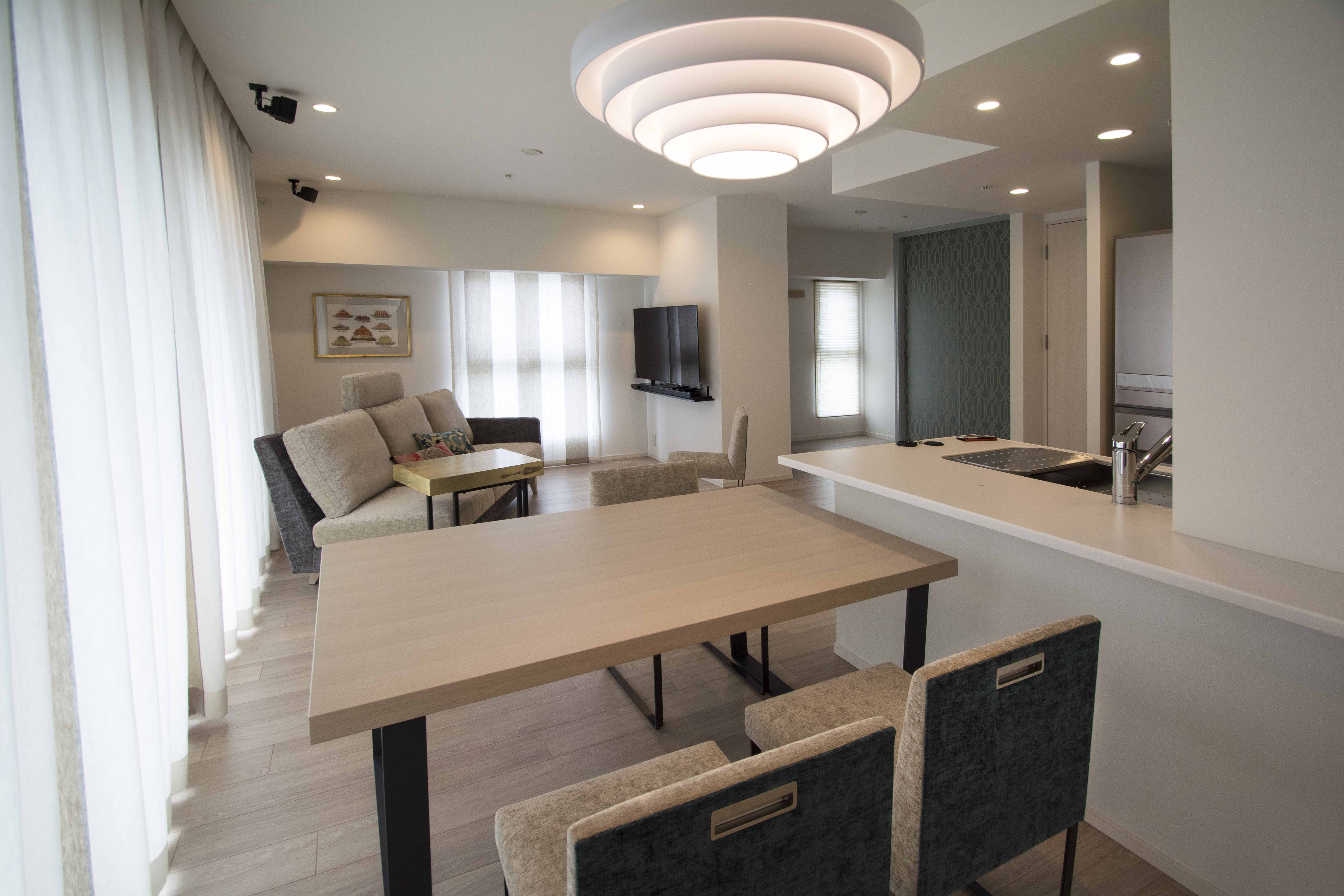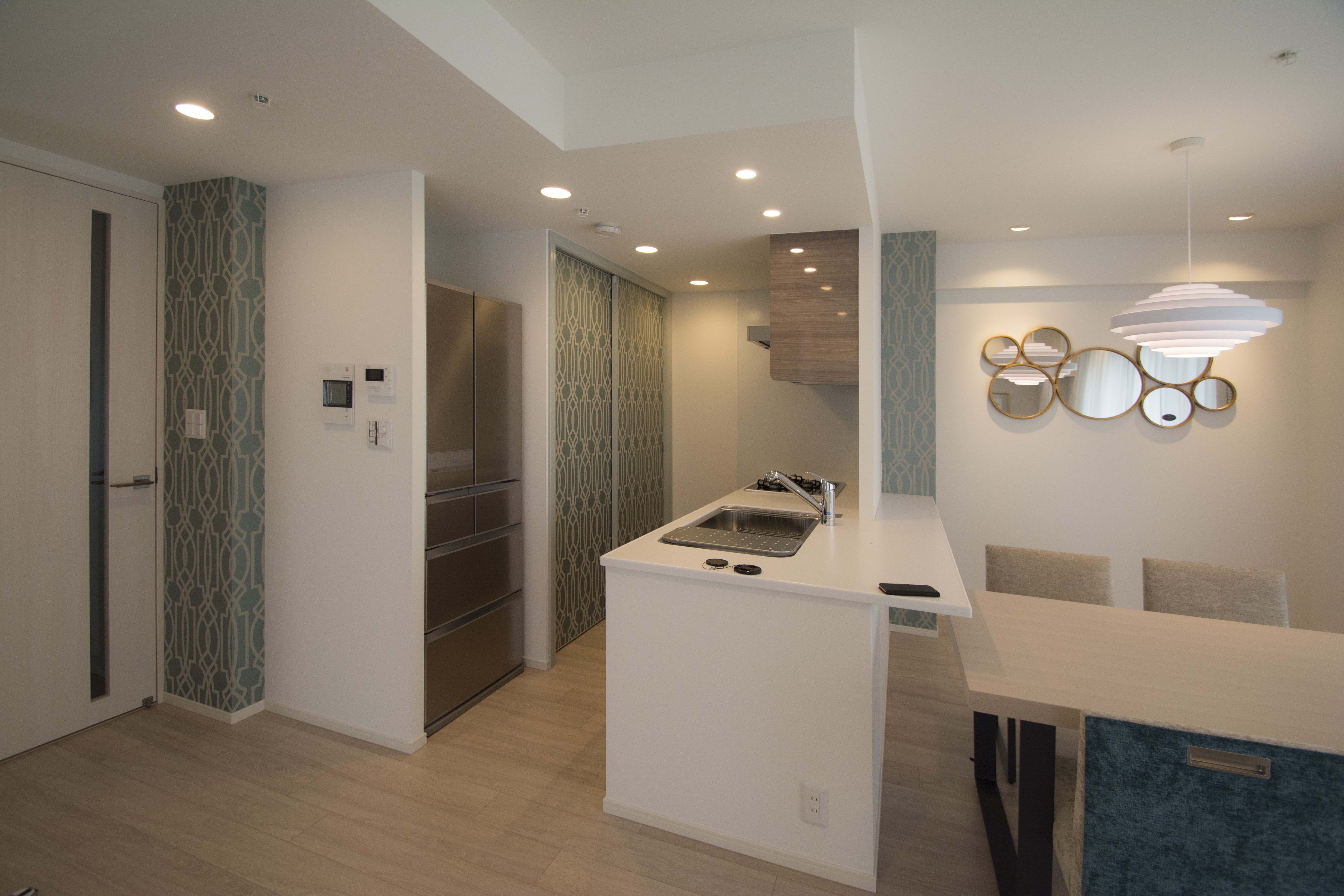 今回の改装は和室をつぶしてリビングを広げることでしたが、まずはテレビをどこに置くか、ソファをどういう角度に向けるかなど、レイアウトから考え、和室側の壁をむしろ伸ばして、そこに下地をいれ配管を通して、壁掛けテレビをおけるようにし、線をすべて見えないように考えました。テレビの下には一体に見えるようにぎりぎりに棚をつけてスピーカーと光のボックスを置けるようにしました。この裏はご主人様の書斎コーナーで、机と棚をつくっています。こうするとリビングに入った時に、テレビが目に入らず、邪魔にもならず、ソファの位置を壁側に持ってきているのでお部屋が大きく見えます